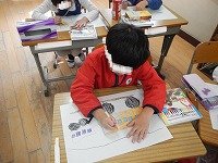 わりばしを使って墨絵をかいています。ランドセルのステッチまで細かくみていました。