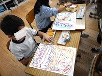 算数で『かたち』の学習をした後、ご家庭で集めていただいた箱をつかって、絵をかきました。