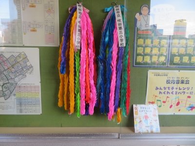 修学旅行に持っていく折り鶴は、職員室横のガラスケースに展示しています。その横には、校長おすすめの絵本や音楽会のポスターもあります。
