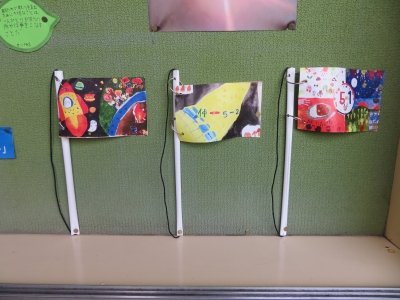 🚩さらに、横には5年生が作った林間学習の旗のミニチュアも飾られています。🏕️