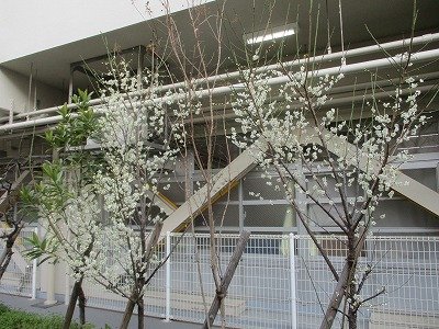 職員室横の中庭に植わっている梅のつぼみが膨らみ、咲きだすものもありました。写真は、白梅で可憐に咲いているさまは、冬の終わりを告げているようでした。