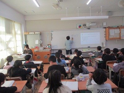 3年生で分数を習います。足し算引き算については、分数の仕組みを理解していないとわからないところがあります。教科書の問題を手掛かりに、どうやったら答えを出せるだろうと、子ども達はそれぞれ自分の考えをノートに書いていました。それを前に映し出し、発表活動をしていました。