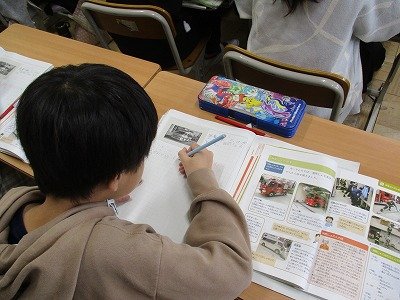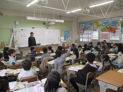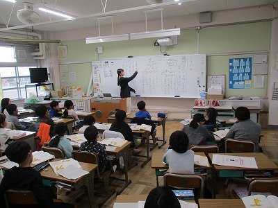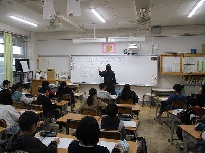 本校では、2学期より一部教科担任制を取り入れています。他のクラスの先生が来ても、子ども達はいつもと変りなく一生懸命勉強しています。写真は、5年生の社会と英語の授業の様子です。
