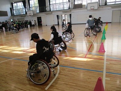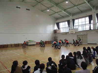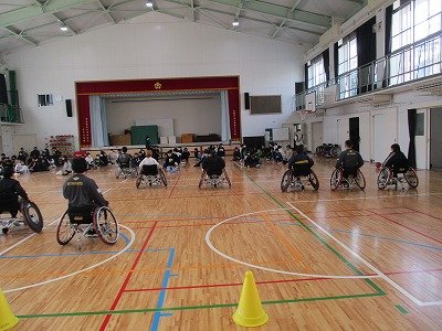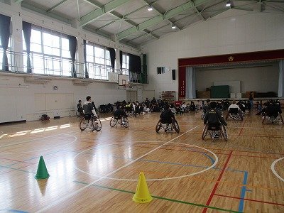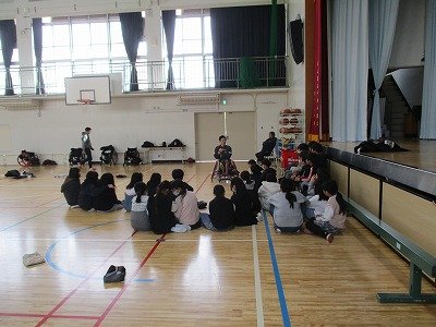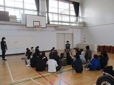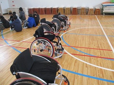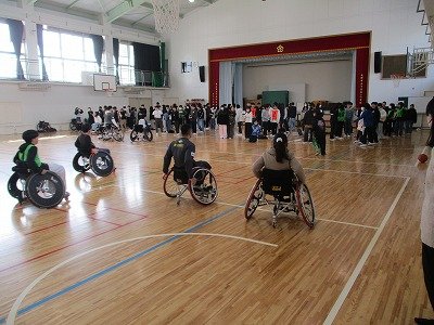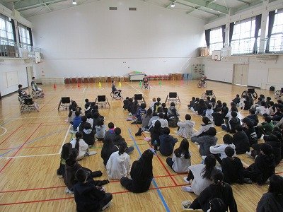 昨年度に引き続き、今年度もPTAのご協力もあり、6年生対象の車いすバスケ体験会を開催することができました。始めは、少し緊張気味の子ども達も、車いすに乗って操作したり、クラス代表同士の車いすバスケを見たりする中でほぐれていったようです。最後に、選手一人につき一クラスで質問コーナーがあり、そこでいろんなことを聞いていくうちに、引き込まれていく様子が伺えました。会が終わり、片づけをしているときに、たくさんの子がサインをもらいに来ていました。それぞれで感じたことがあった会でした。