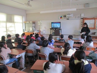 2月に、どの学年でも人権について考えるビデオを視聴しています。写真は、3年生の様子です。体に障がいがある人の思いや願いを知り、自分たちがどう行動したらいいかを考えていました。他にも、目が見えない人のお話や耳が聞こえない人のお話などを知ることによって、子ども達が人権を大切にする気持ちを育んでいます。