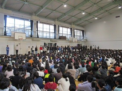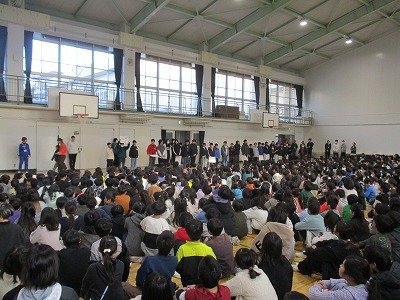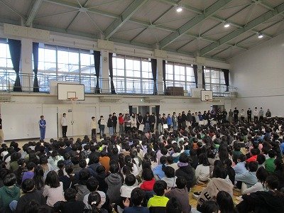 1月児童集会を行いました。今回は、給食委員会から給食の歴史について発表がありました。太平洋戦争が終わった後、食糧難の中、子ども達を飢えさせないために始まったことなどを伝えていました。今あることが当たり前でないことをみんなで確認しました。