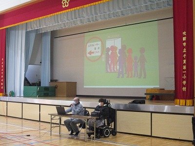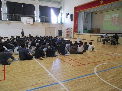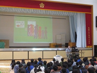 1月22日、4時間目体育館にて、5年生福祉教育の一環として、ゲストティーチャーを招きお話を聞きました。道路上によくある場面を見て、車いすの人の立場だったら、どう感じるか、何が困るかを想像しながら話を聞いてきました。子ども達の感想を見ると、知らなかったことや知っていたこともあり、もし車いすの人が困っている場面に出くわしたら、声をかけて手伝いたいと感じた子も多かったようです。