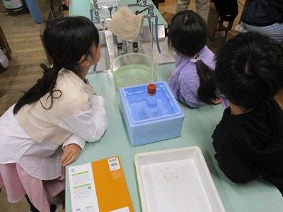 理科室で、ものの温度の変化と体積の変化について調べる実験をしていました。自分なりに実験の結果を予想し、それを確かめていきます。今日は、水の体積が温度によってどのように変わるかを実験していました。