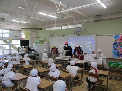 4月21日、本日より1年生も給食を食べることとなりました。事前に、担任の先生からや、栄養教諭の先生から給食の準備の仕方などを教えてもらい、今日は少し早い時間から準備を始めました。担任以外の先生のお手伝いだけではなく、地域の民生委員の方にもボランティアで来ていただき、配膳と片付けの手伝いをしてもらいました。1年生に聞いてみると、「おいしい」「からい」「思ってたよりおいしかった」などの感想が聞かれました。