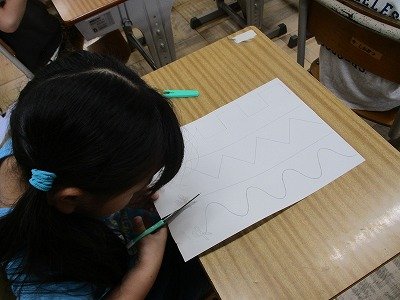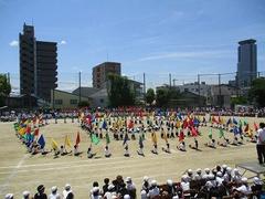 次は、4年生の団体演技です。大きな旗を持ち、それの動きと全体の調和で見るものを引き付けていました。旗を振るときの動きも機敏で、迫力がありました。隊形移動をし、同じ色が斜めにそろいきれいな形を作ることもできていました。