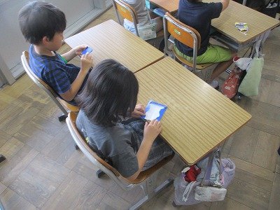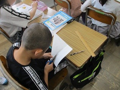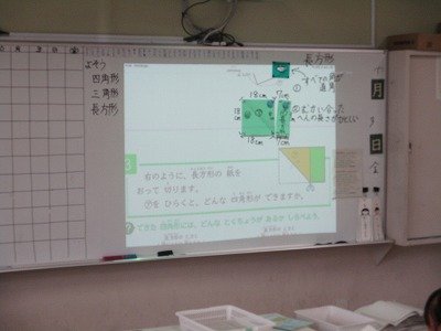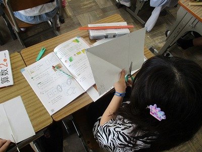 2年の算数では四角形の特徴を調べる学習をしています。この時間は、長方形を習った後、正方形についても調べていくことをしていました。配られた紙を切ったり、核の大きさを測ったりして、正方形の性質をみんなで確認していました。