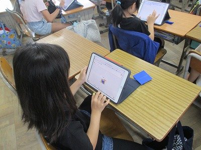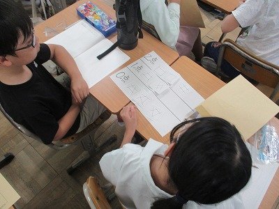 4年生算数では、平行四辺形や台形など、特徴のある形の四角形について勉強しています。ペアで特徴ごとに四角形を分けたり、その理由を考えたり、自分たちで分けたものをオクリンクで全体に共有したりしながら学習を進めていました。