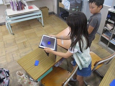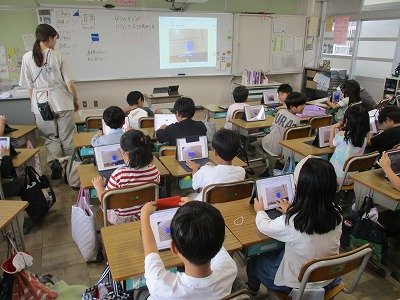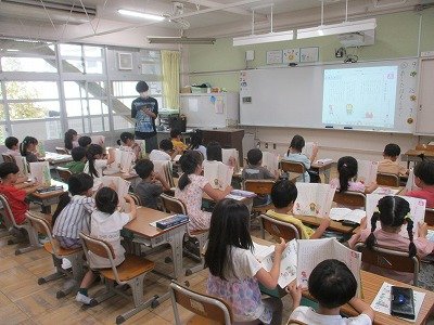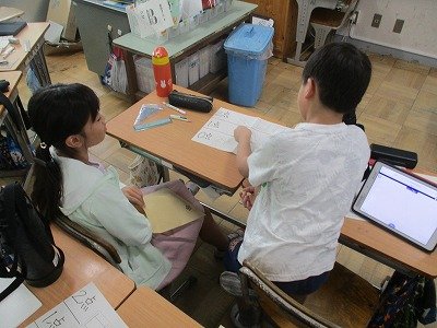 2年算数では、四角形の性質をつかみ、長方形や正方形について学びます。この授業では、先生が作った変わった形の折り紙を使い、四角形を作ってみる活動をしていました。子ども達は手を使いながら、四角形の感覚をつかんでいました。自分が作った四角形を写真に撮り、オクリンクで共有し、お互いの四角形を見合いっこしていました。