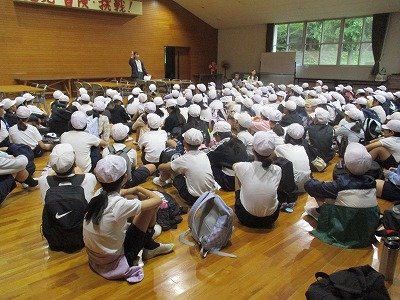 10月8日、今日は児童集会がありました。6年生から折り鶴作成のお願いや児童議会、委員会からのクイズを聞きました。最後に、前期児童議会の6年生の話を聞くときの子ども達は、とても静かに聞いていました。