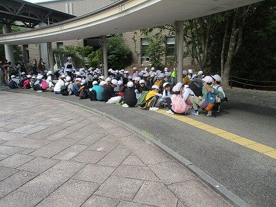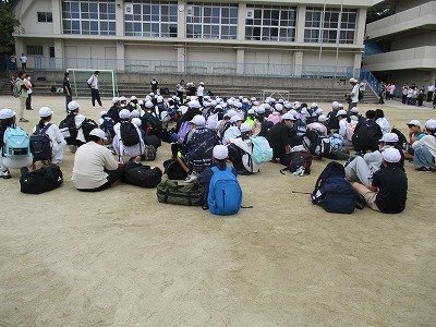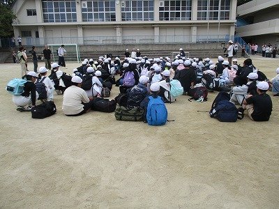 運動場を使って、1年生の交通安全教室が開催されました。大阪府警の方と市役所の方に来ていただき、交通ルールで気を付けないといけないことを教えてもらってから、運動場に再現された道路や交通信号、標識などを確認しながら安全に歩くということを行いました。自分の命を自分で守る観点からも貴重な経験となりました。