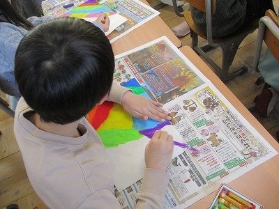 色を塗りこみ、きれいな色のデザインを作る(3年図工)