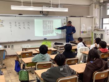 3年生の教室に、消防署で働いているOさんが来てくださいました。消防署でのお仕事にはたくさんの種類があること、消火栓や消火器の仕組みについての話など、詳しく教えていただきました。