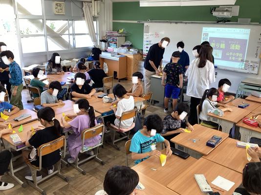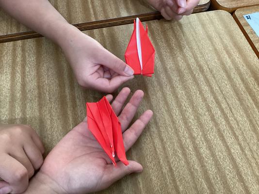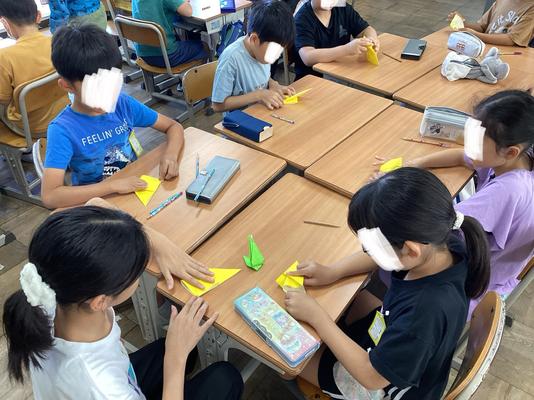 本日は、平和記念公園の貞子の像に捧げる千羽鶴の製作を全校で行いました。写真は6年生が各学年に千羽鶴の折り方を伝える様子です。