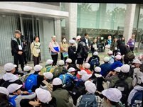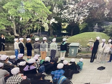 平和記念公園に着き、供養塔の前で、セレモニーを行いました。みんなで作った折り鶴をささげ、平和の誓いをしました。楽しみにしていた昼食を食べて、これからピースボランティアさんと碑めぐりです。