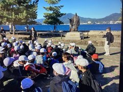 ピースボランティアの方と平和の灯、供養塔、原爆の子の像などをめぐりました。それぞれがつくられた経緯や意味を真剣に語ってくださいました。温かで真剣なお話しに子どもたちは引き込まれて聴いていました。これから資料館を見学し、その後は公園を散策します。