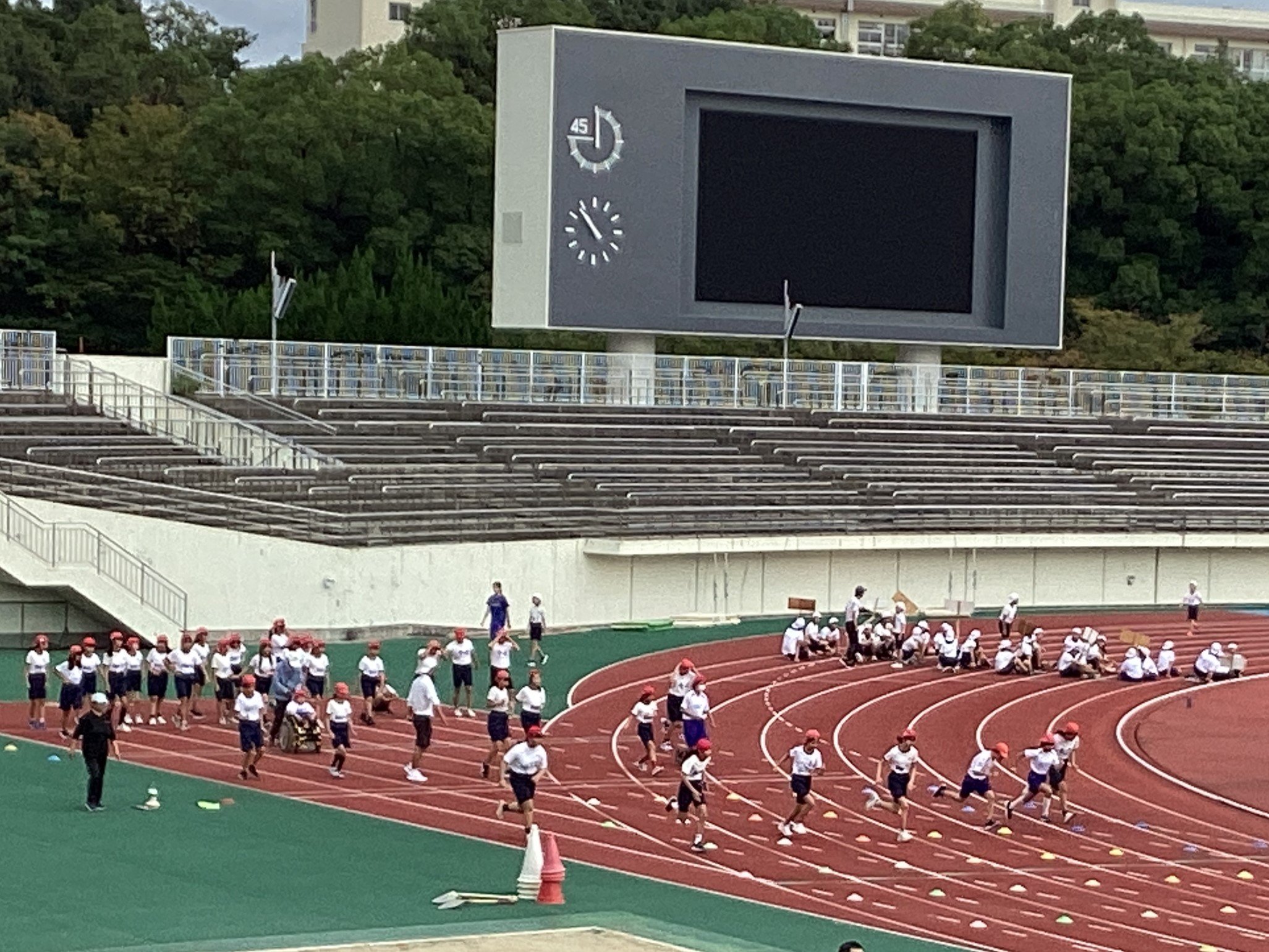 6年生の陸上大会がありました。秋風の涼しさを感じながら、100m走、ハードル走、走り幅跳びなどの競技を、吹田市内の6年生とともに計測しました。本格的な陸上競技場で走った経験は、思い出に残るのではないでしょうか。友だちをいっしょうけんめいに応援する姿がとても素敵でした。参観にかけつけてくださった保護者のみなさま、本大会を運営してくださった関係者のみなさま、大変にありがとうございました。