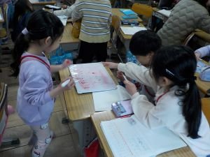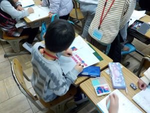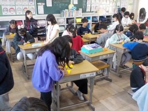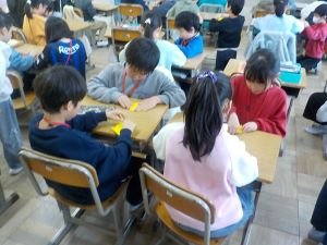 2年生が、折り紙をしていました。つくり方を教え合いながら、飾りをつくっています。何を作っているのかをインタビューしてみると、6年生へのお祝いとのこと。気持ちをこめて、一生懸命につくっていました。