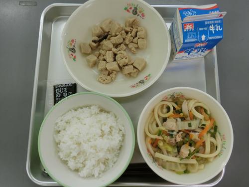 10月15日「とりなんばんうどん」「高野豆腐の煮物」「ごはん」「のり佃煮」