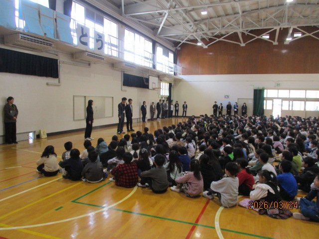 6年生が卒業してしまい体育館は少し寂しくなりましたが、1年生から5年生まで元気に校歌を歌い、お話を聞くことができました。始業式は4月8日、新たな出会いと別れがある季節となっています。きれいな桜が残る形で、入学式、始業式を迎えることができればと思っています。