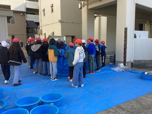今日はすいた体験活動クラブの方に来ていただいて、5年生が先日刈った稲の脱穀と、玉ねぎの苗を植えるための畝づくりを行いました。