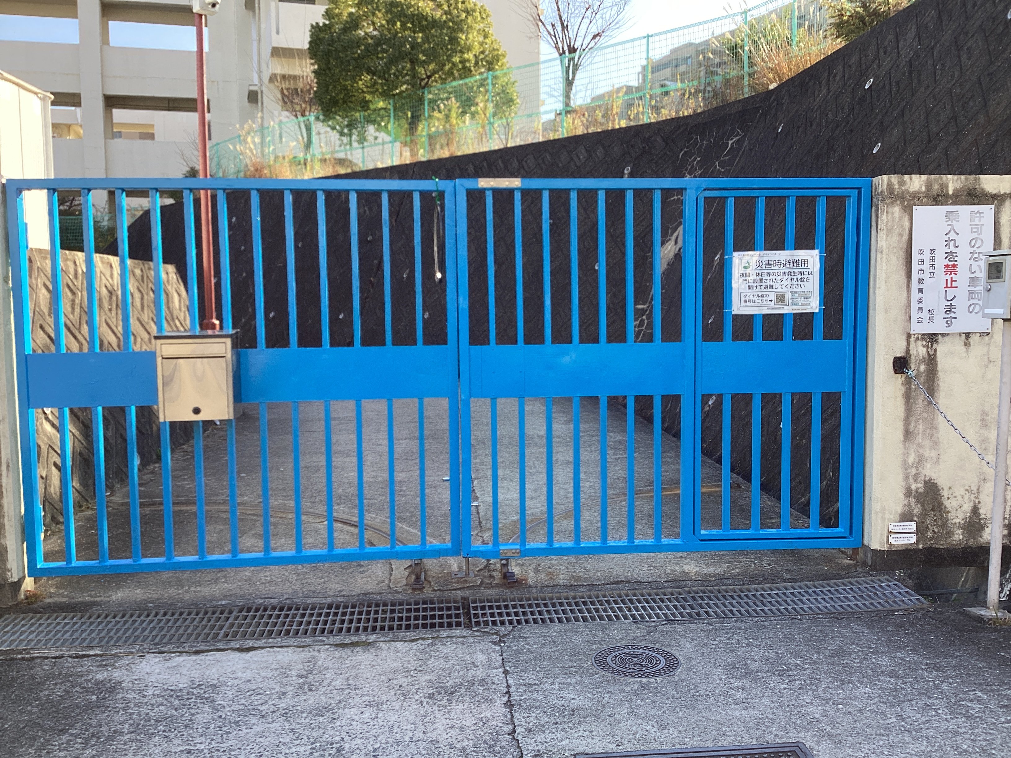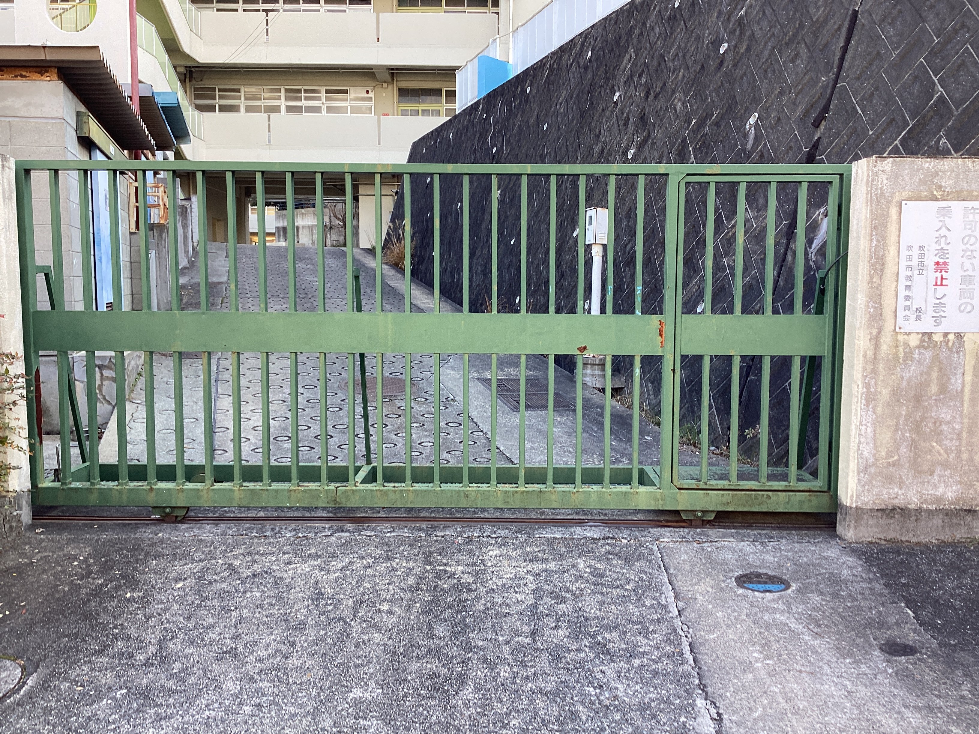 さて、南山田小学校は、子どもたちは使う2つの門(正門と裏門)以外にも、車が出入りするための門が2つあります。一つはごみ庫の近くで、ごみ収集車が出入りするのに使います。もう一つは、教職員が「車両門」と呼んでいるのですが、給食室の近くで、給食の食材を運び入れたり、学校に関連する車両の出入りに使っています。緊急車両はこちらを使います。