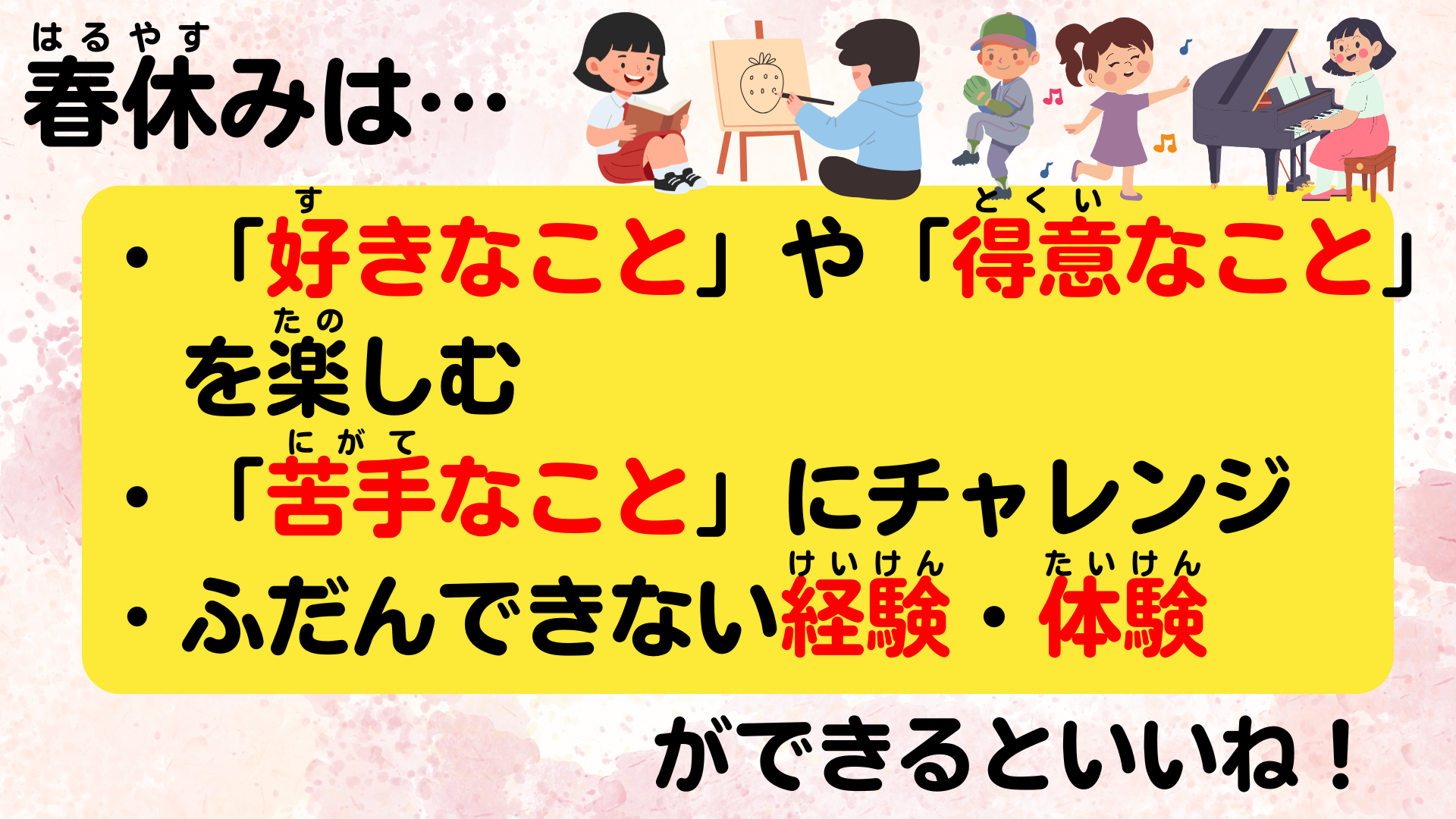 最後には、春休みの過ごし方として、自分の「好き」「得意」を楽しみ、「苦手に」にもチャレンジし、普段できない経験や体験をしてほしいと伝えて終わりました。