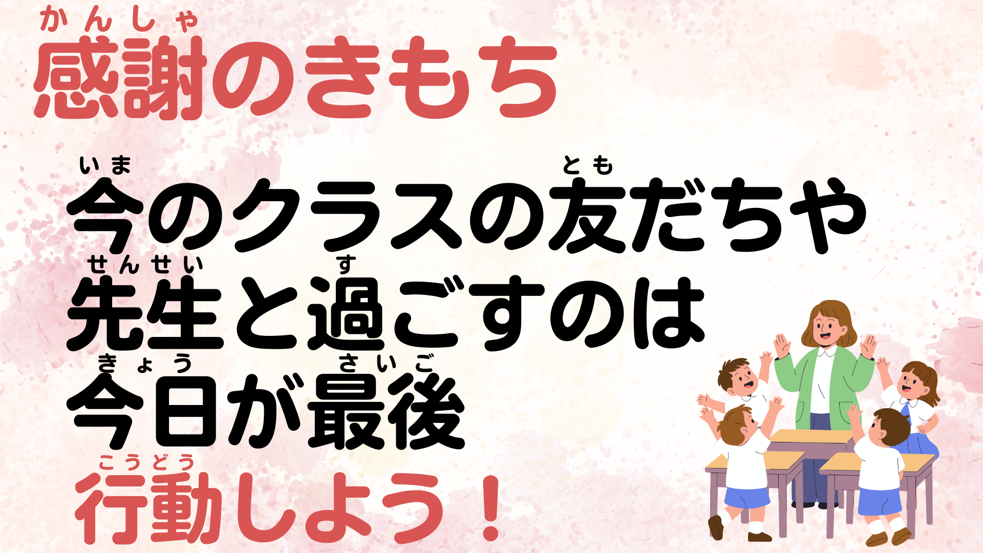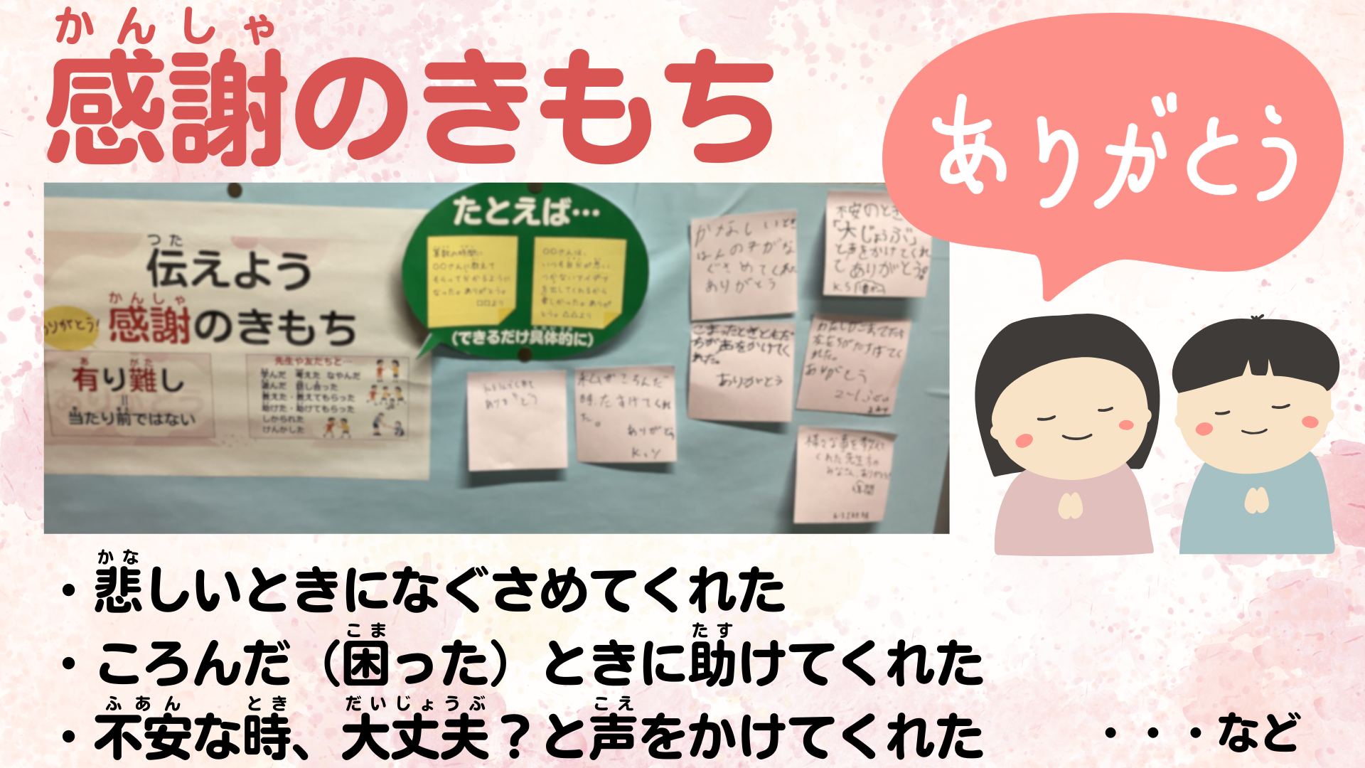 そして、次に、「感謝の気持ちを伝える」ということについても、校長室前に貼っている付箋を紹介し、今日が今のクラスで過ごす最後の日だから言葉や行動で感謝の気持ちを表せるといいねと伝えました。