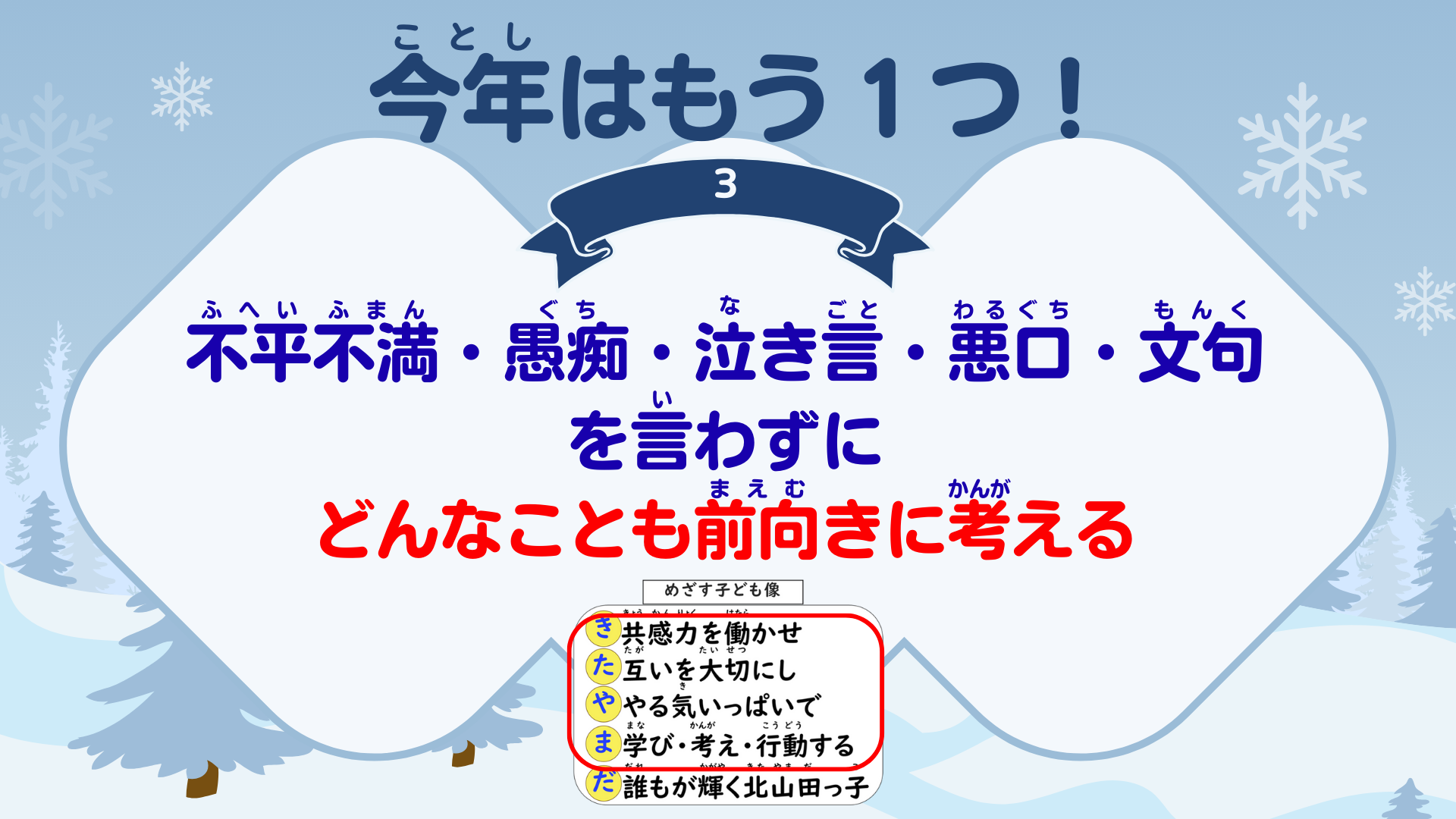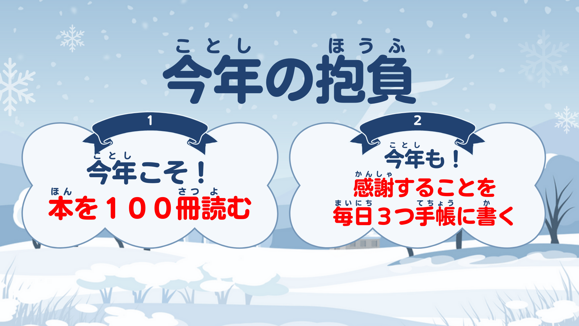 達成できるように頑張ってほしいですね。そして、僕も抱負を3つ宣言。昨年に引き続き、「①感謝することを3つ毎日書く」「②本を100冊読む」に取り組むのと、さらに「③不平不満、愚痴、泣き言、悪口、文句を言わず、何事も前向きに考える」を加えた3つです。去年は100冊読書が達成できませんでしたが、丙午の今年は必ず3つとも達成できるように頑張ります!