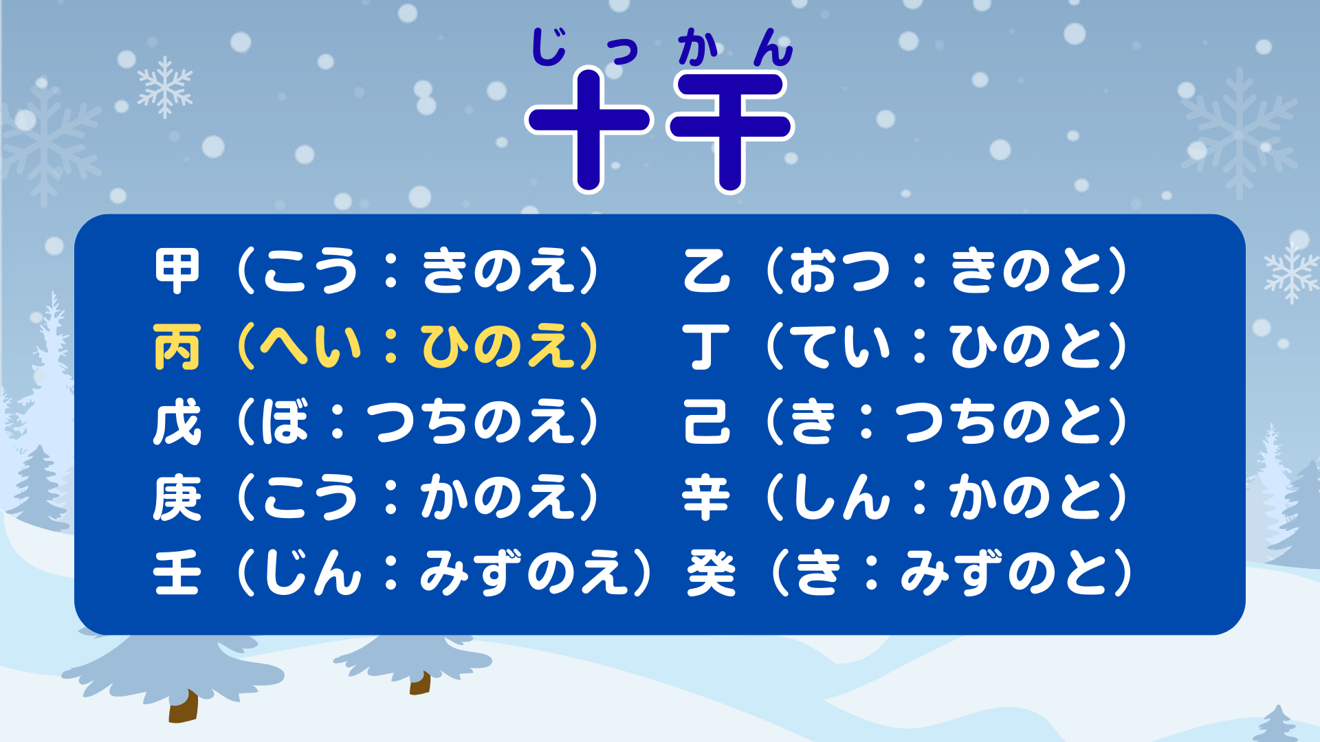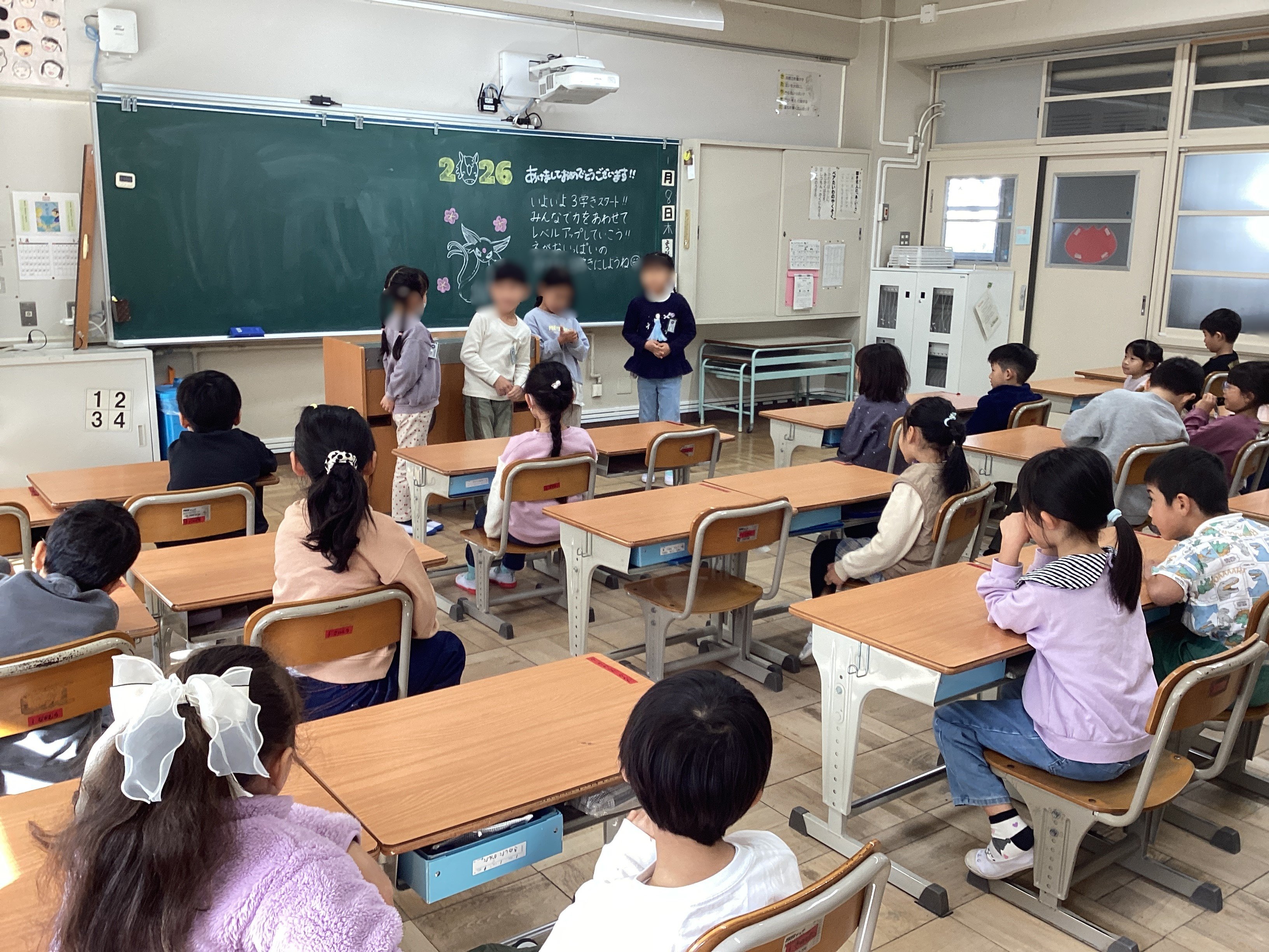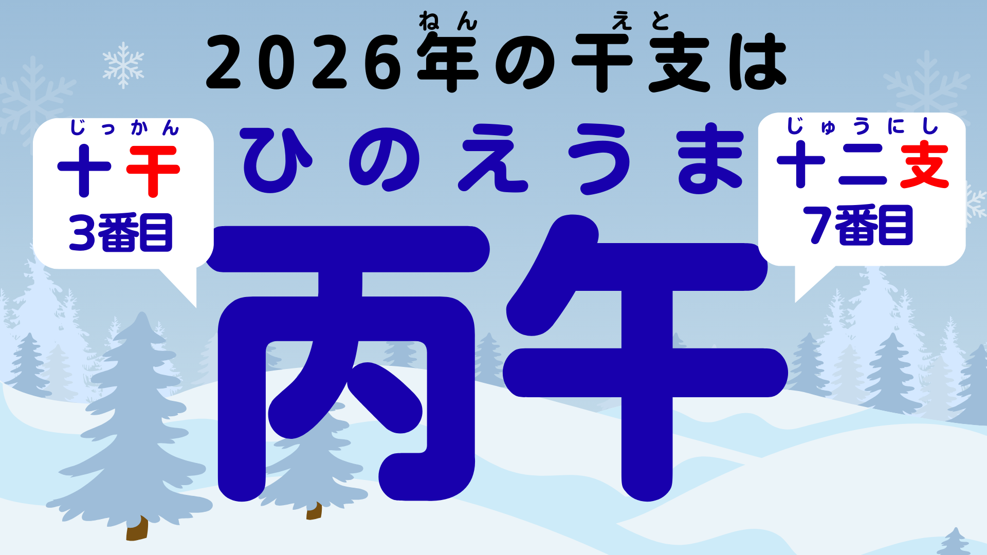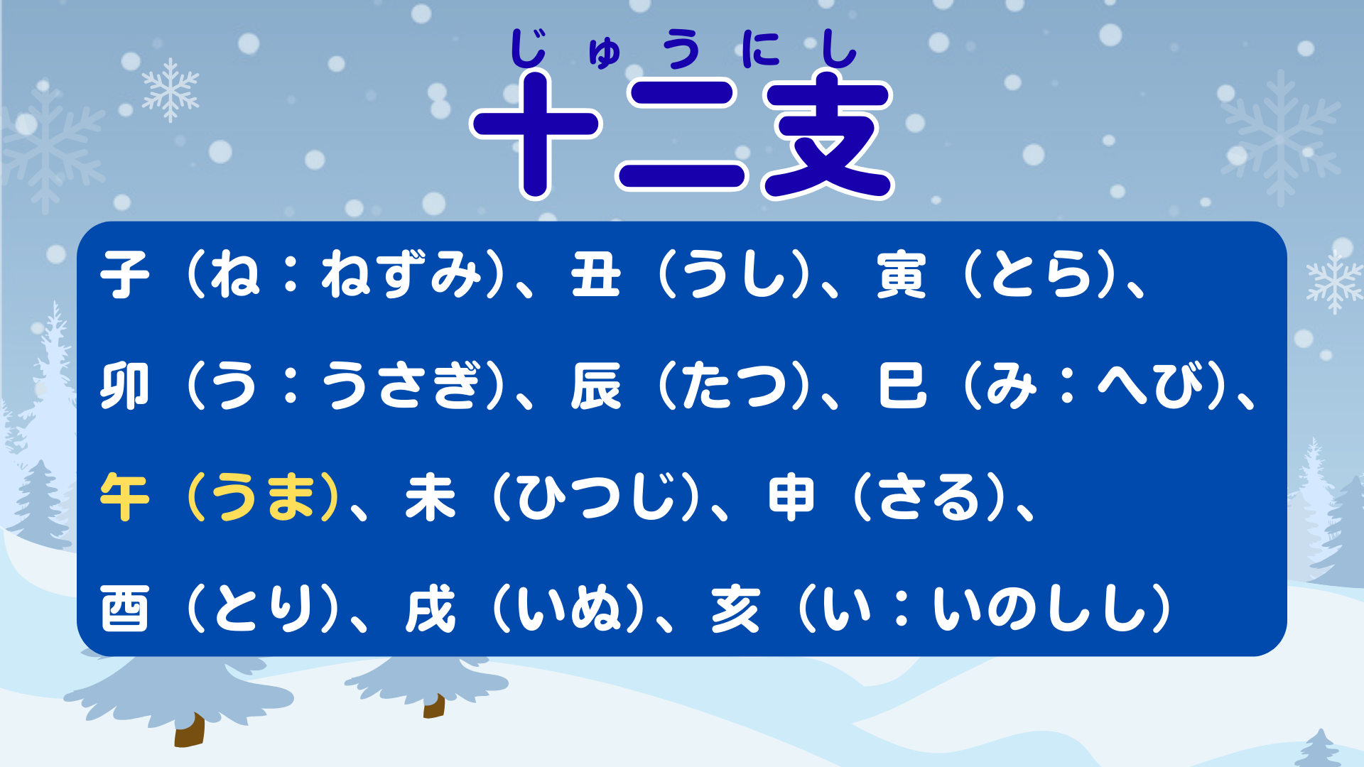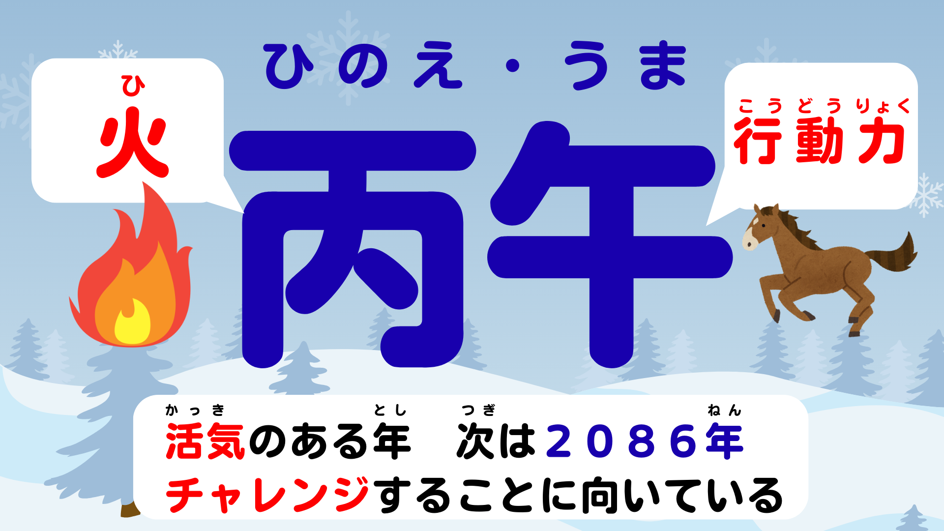 子どもたちに「今年の干支は?」と尋ねるところからスタート。子どもたちは「うま!」と口々に答えてくれましたが、それは十二支だよと伝え、干支はそれに十干を合わせたもので、今年は丙午(ひのえうま)だと話しました。丙は火を表し、午は行動力の象徴なので、丙午の今年は、活気があって何かにチャレンジするのにとてもいい年だということで、子どもたちに今年の抱負を尋ねると・・・