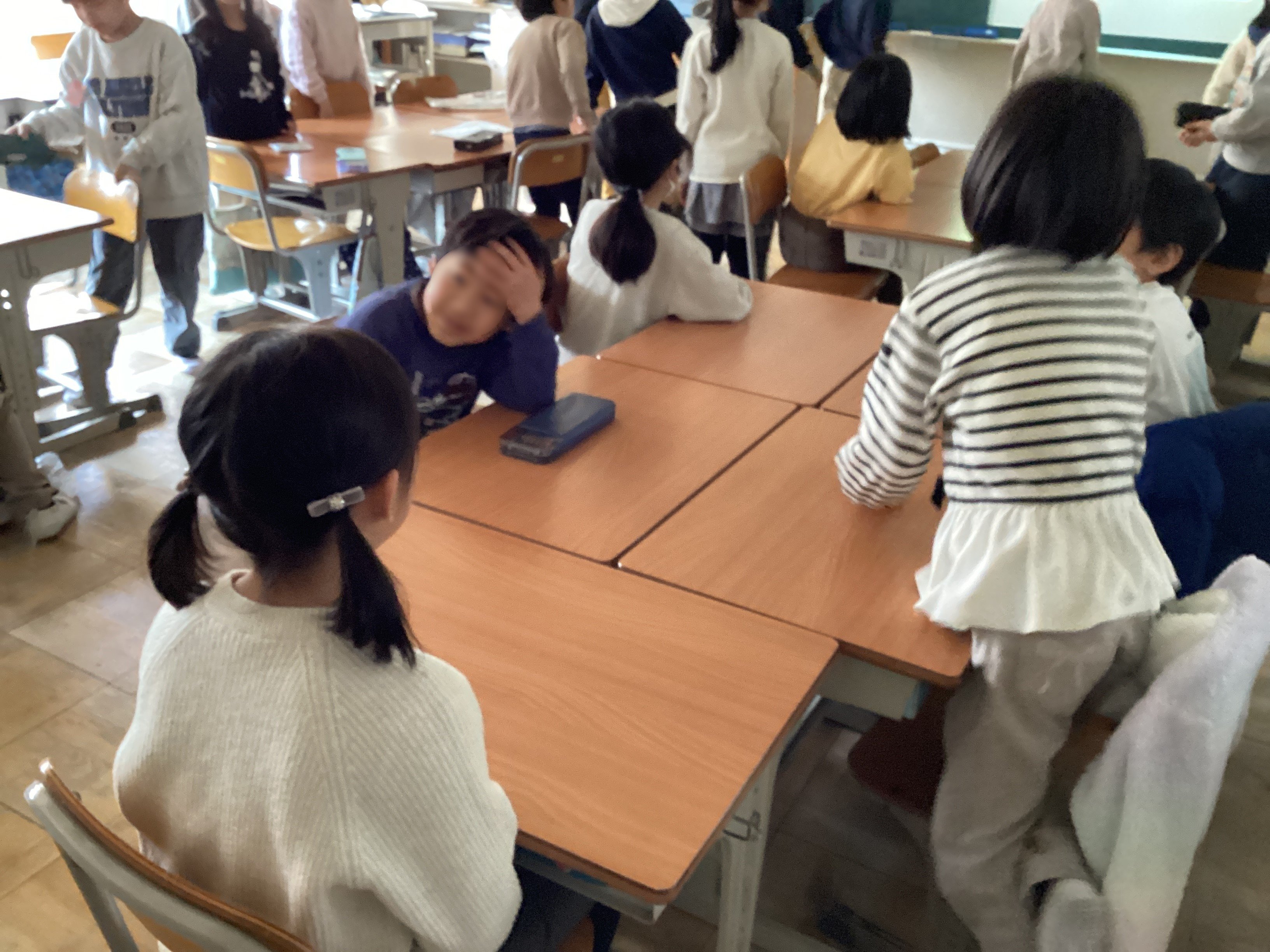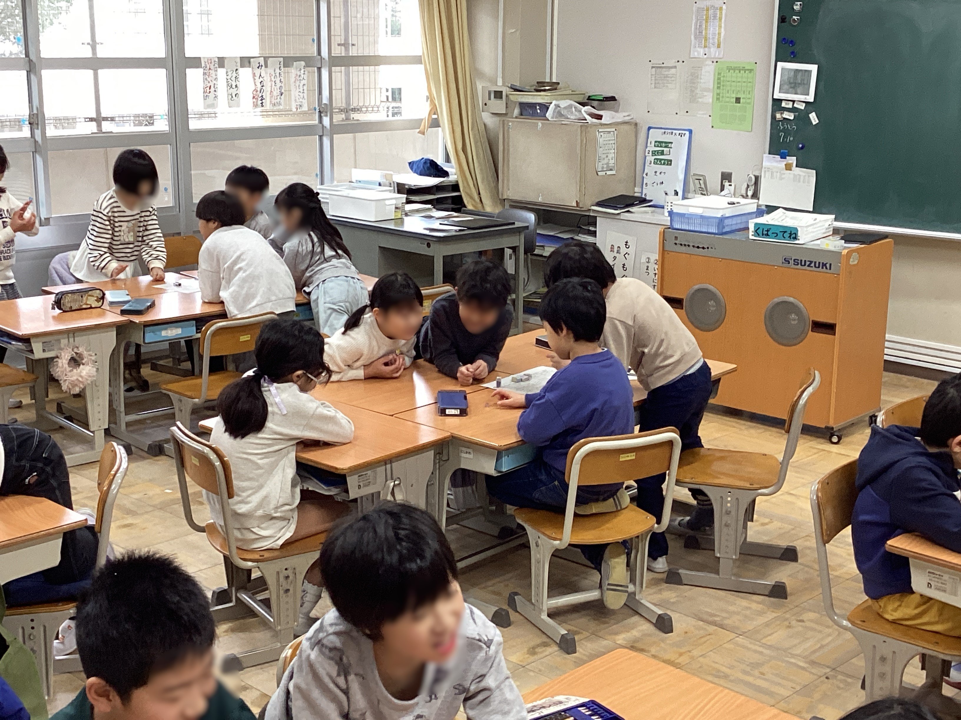 4年生も国語の授業で「理由をぎんみする」という単元に取り組んでいました。書くことにおいて、自分の考えとそれを支える理由との関係を明確にして、書き表し方を工夫することがねらい。教室に入った時は、「2年生とのみんな遊びはドッジボールにする。」という考えを支える理由として、「2年生の妹がドッジボールが好きだから。」は適しているのかということについて歩き回って自分の考えを多くの人と交流した後、全体で対話している場面。展開にメリハリがあり、自分事として友だちの意見を大切に聴くとともに、自分の言葉でしっかりと語っている姿が見られました。