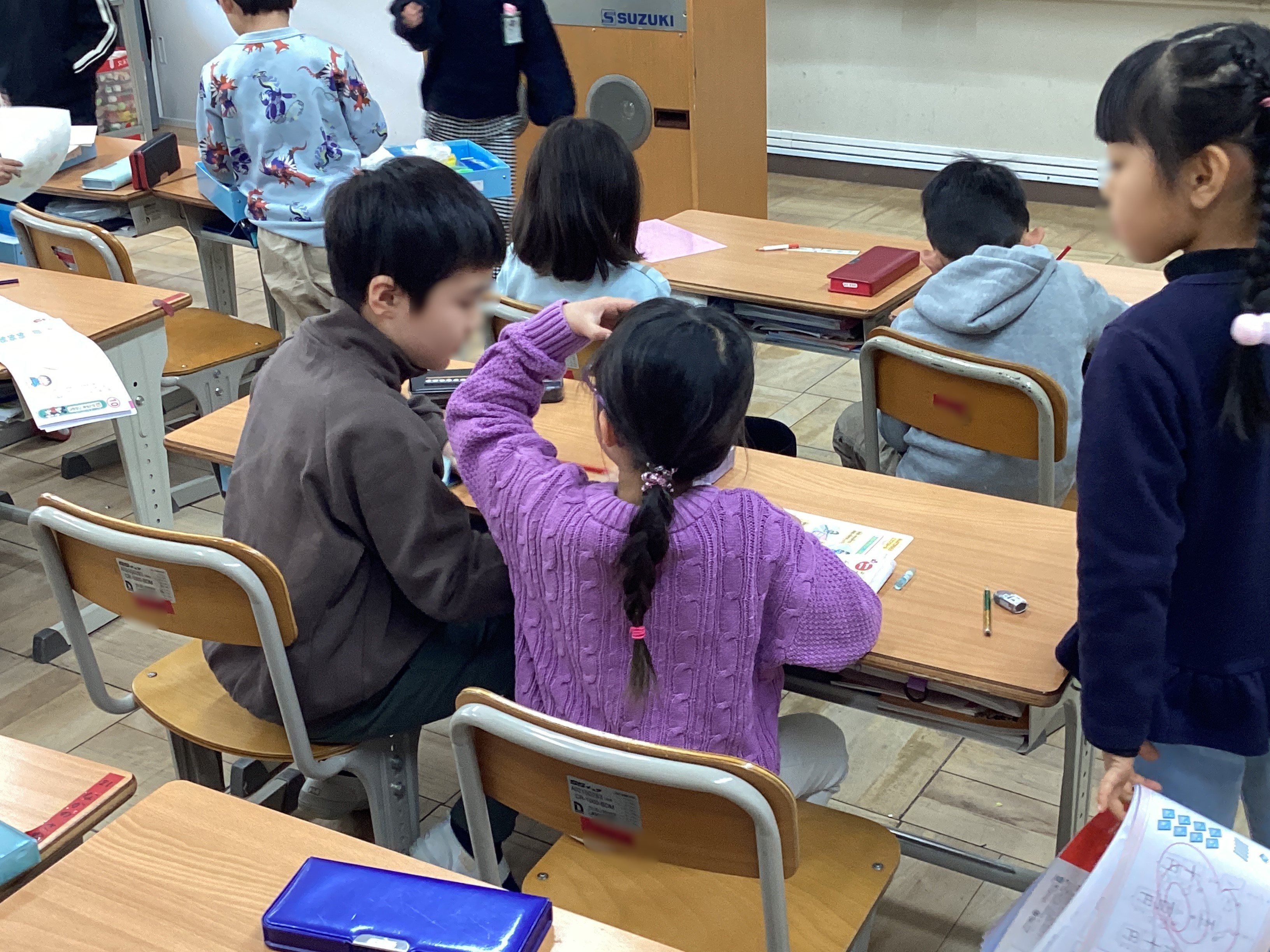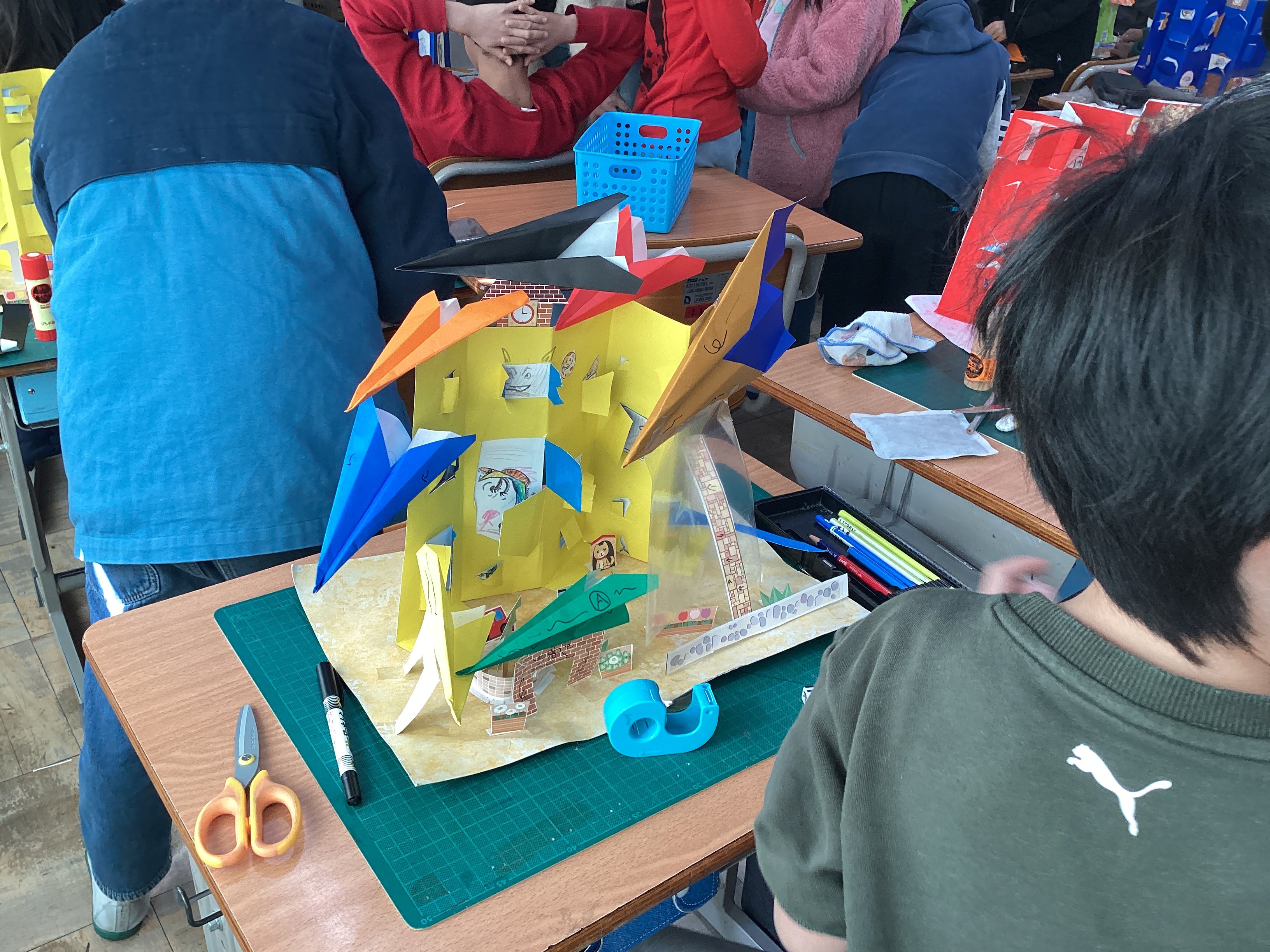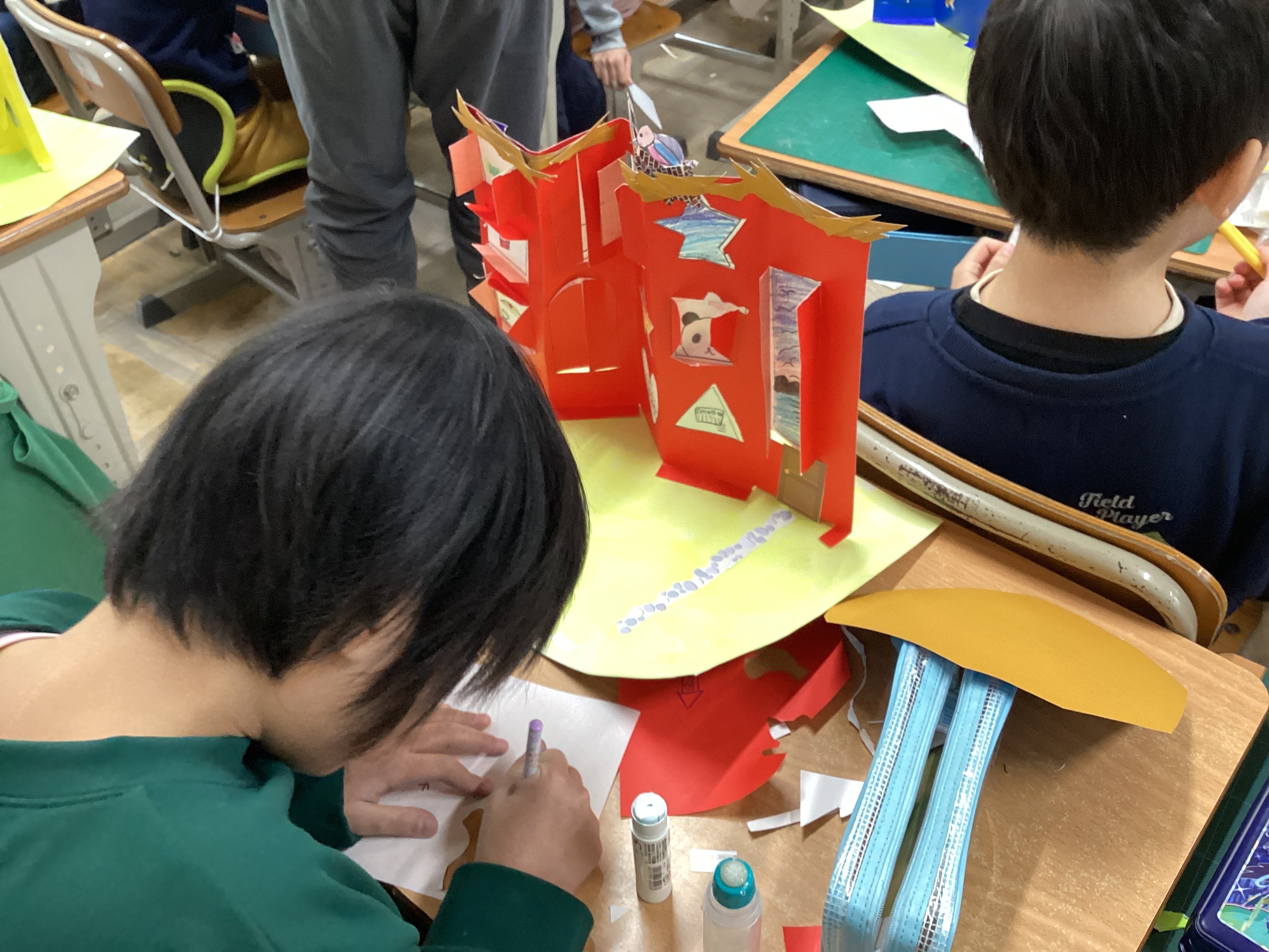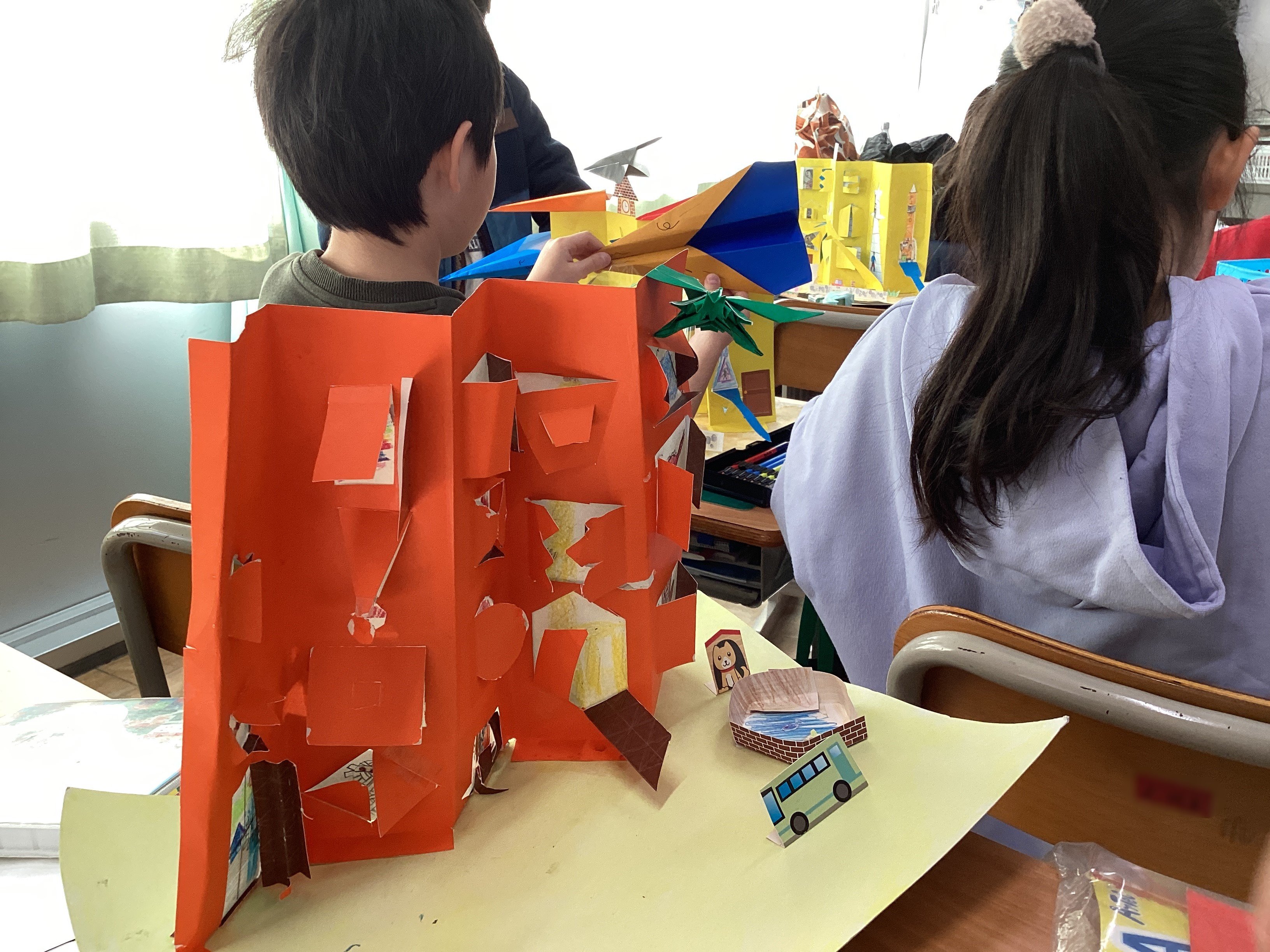 2年生の教室でも図工が行われていました。画用紙で思い思いの窓をつけた建物を作っていて、窓の中には楽しそうな子どもたちやお花、動物などそれぞれが大好きなものを描いており、その建物の周りにも飛行機を飛ばしたり、鳥の巣を作ったり庭を作ったりとそれぞれに工夫がいっぱい。あちこちから「見て!」とアピールする声が。楽しんで作る姿が印象的でした。