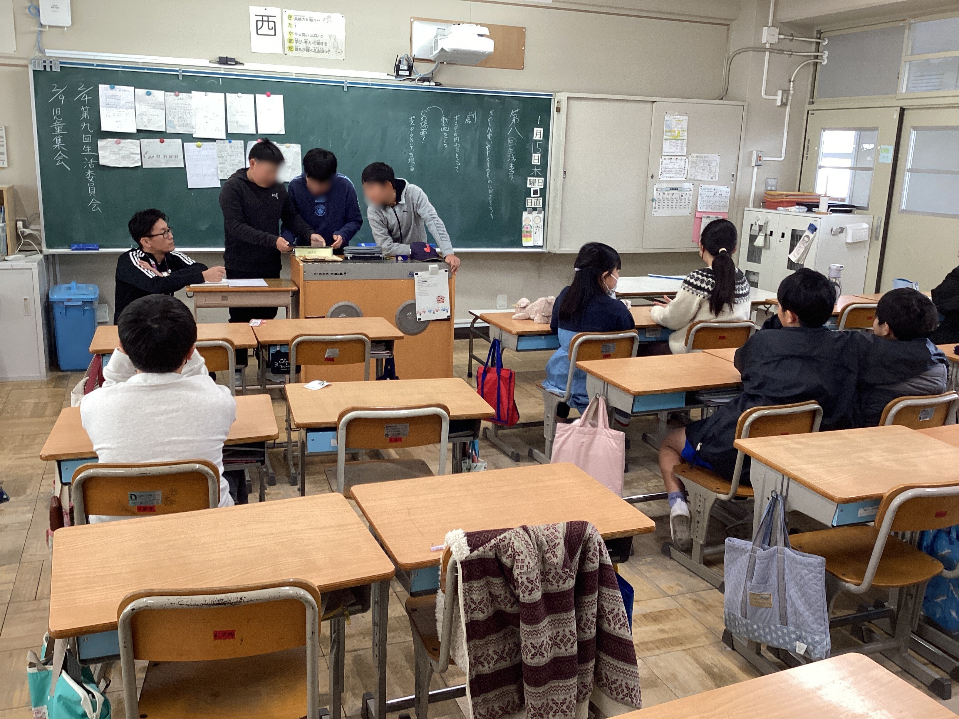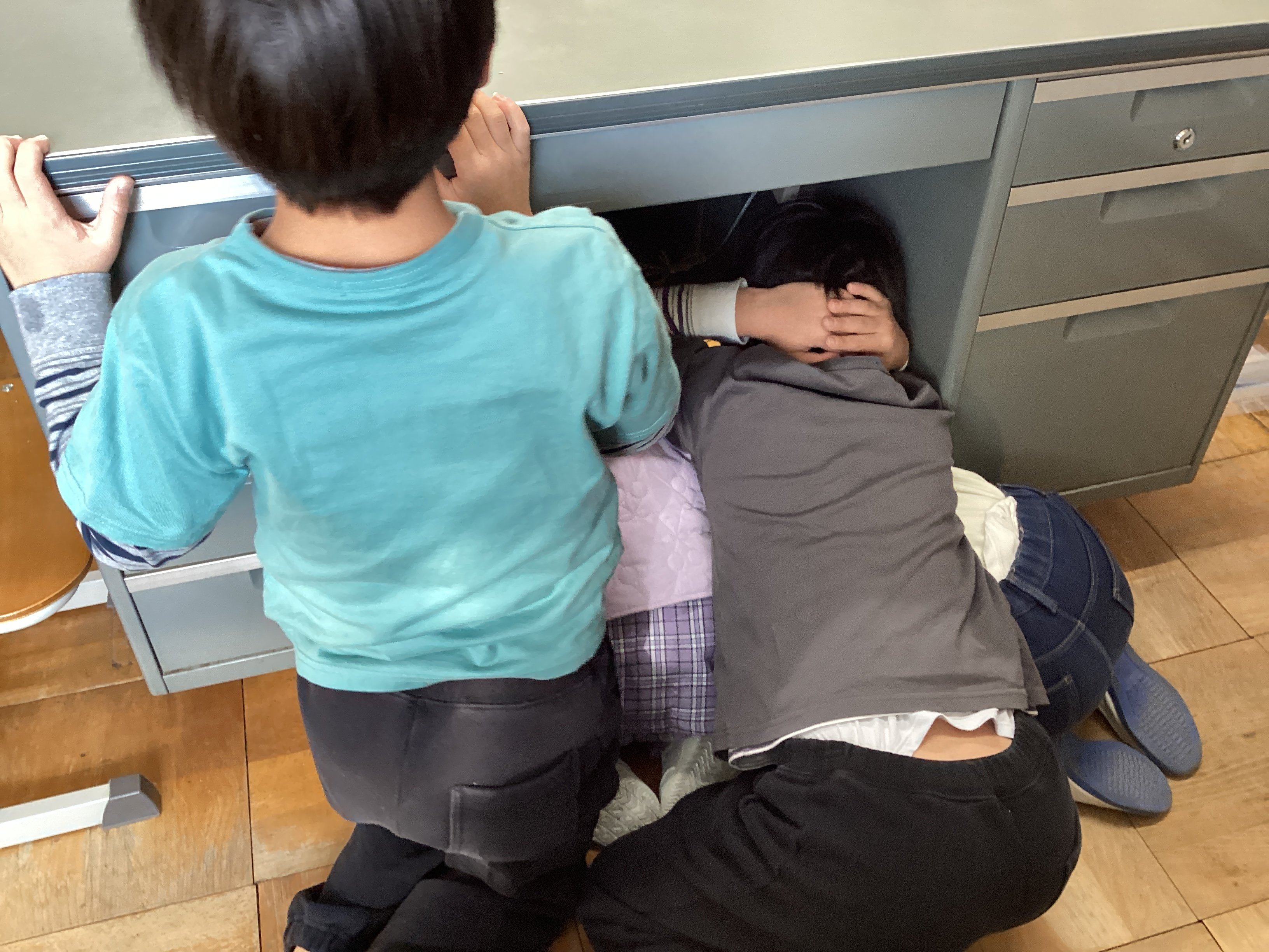 いつ避難訓練が行われるのか子どもたちには知らせていなかったので、業間休みはいつも通り校長室にも子どもたちが来ていました。10時25分、地震発生の放送が流れると同時に校長室に来ていた子どもたちは僕の指示もない中ですぐに机の下に避難。机の下に潜れない子も頭を守り、低い姿勢を取っていました。