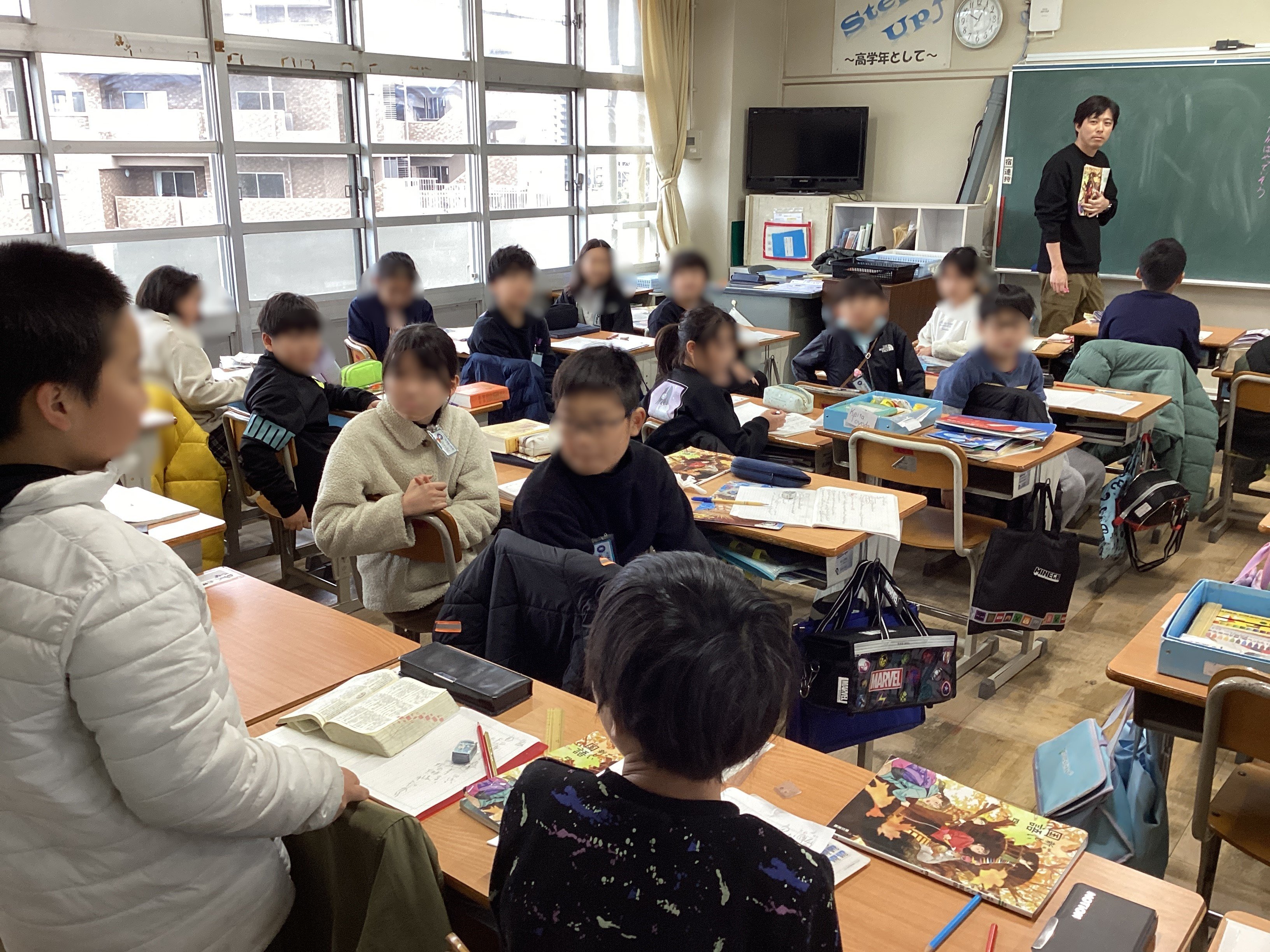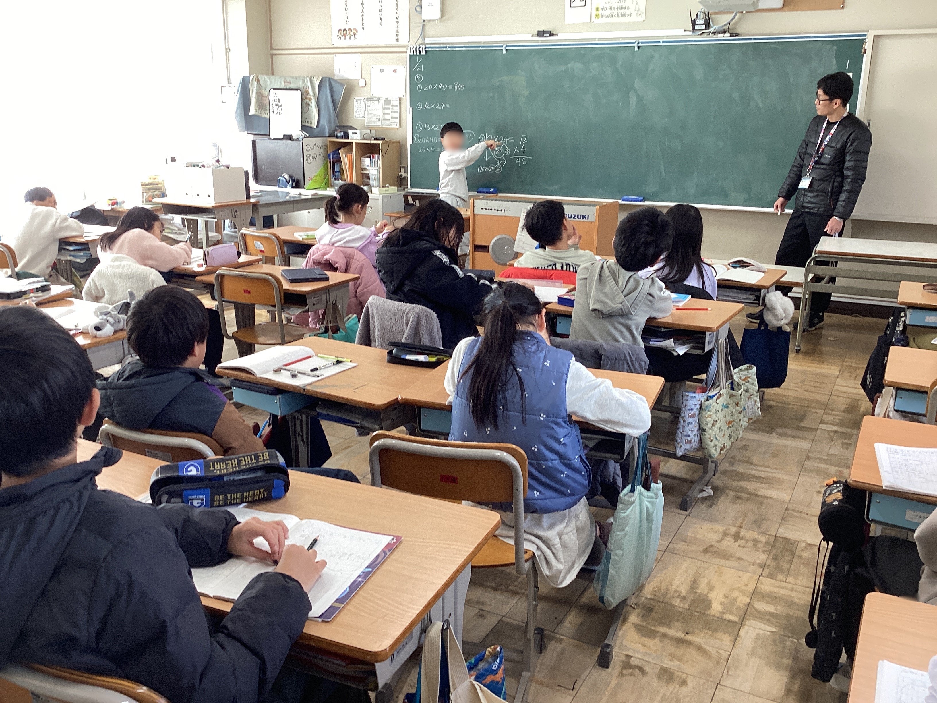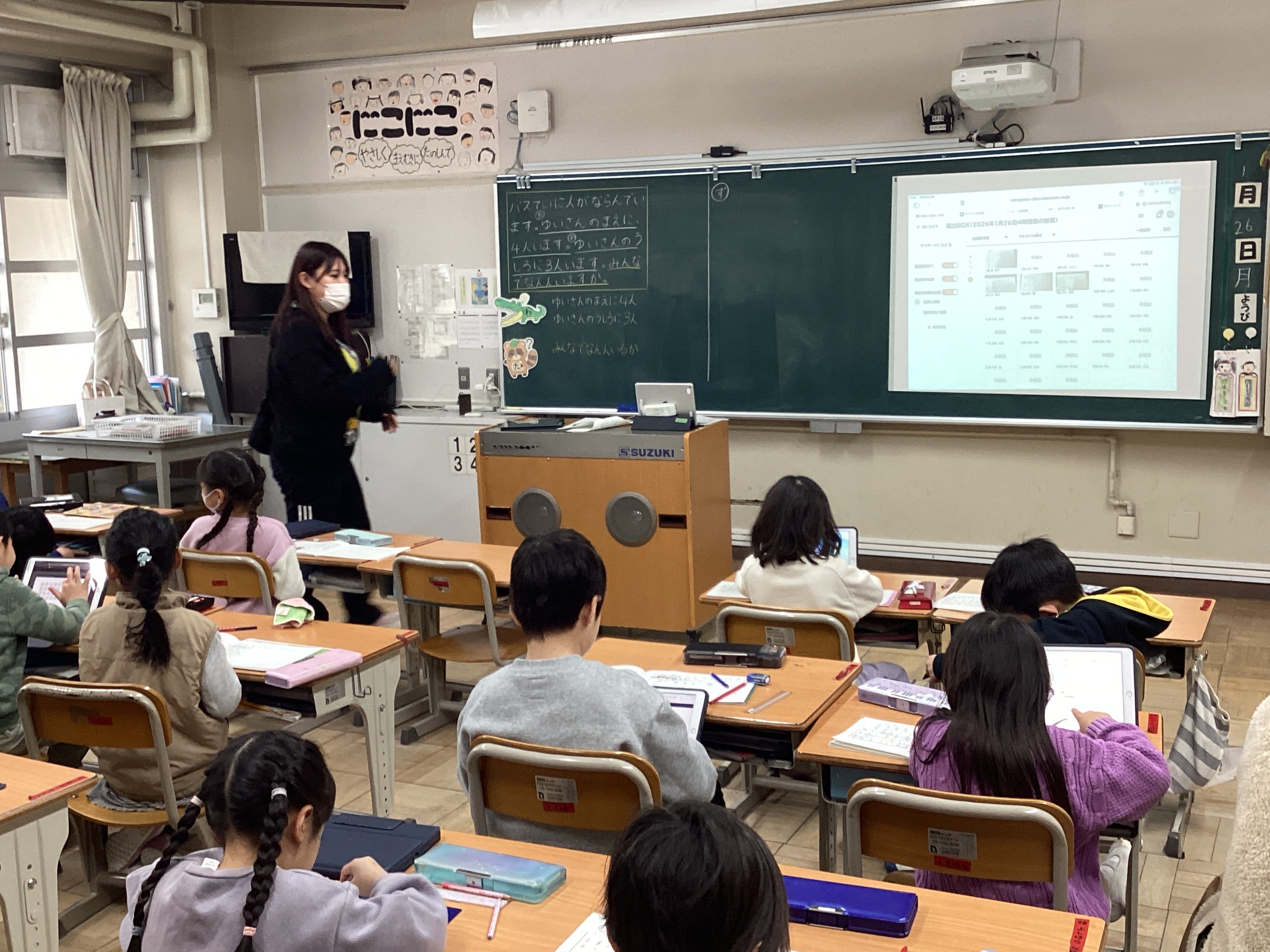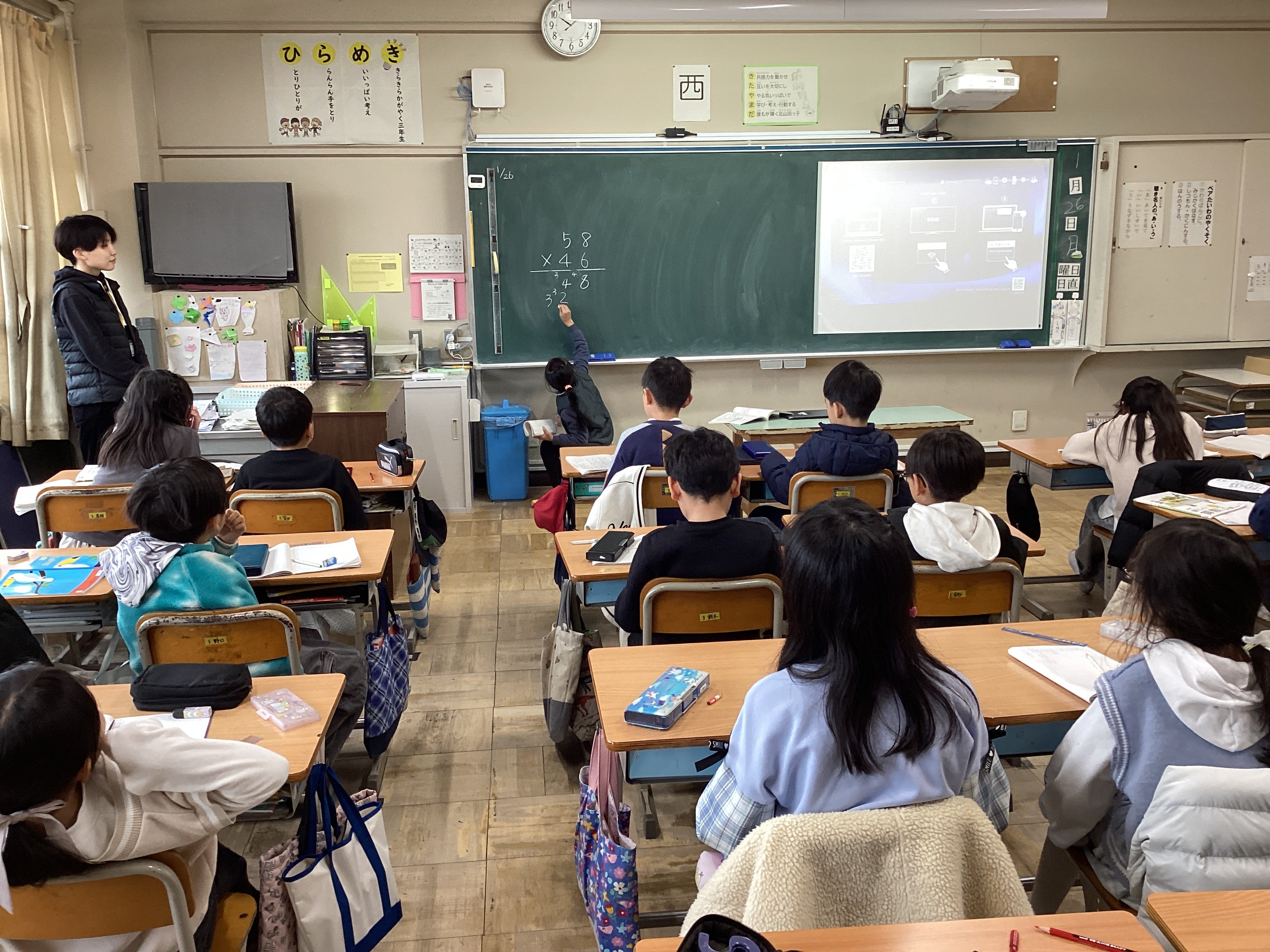 3年生の教室では算数。2桁×2桁の計算について学習です。教師が計算方法を教えて子どもがひたすら計算練習をするのではなく、子どもが計算の仕方を考え、どう説明すれば聴き手に分かってもらえるかを考えながら説明していました。そのように意識して説明してくれているので、途中でちゃんと聴いている子が「え?」「どういうこと?」とつぶやいたり、「そうじゃなくて...」と言いながら前に出てきて補足説明しようとしたりしていました。担任は、子どもたちに「自分たちの授業は自分たちが創る」という意識を持ってほしいと願っており、そのような声かけや支援を心がけているので、それが少しずつ子どもの姿として現れてきているように感じました。