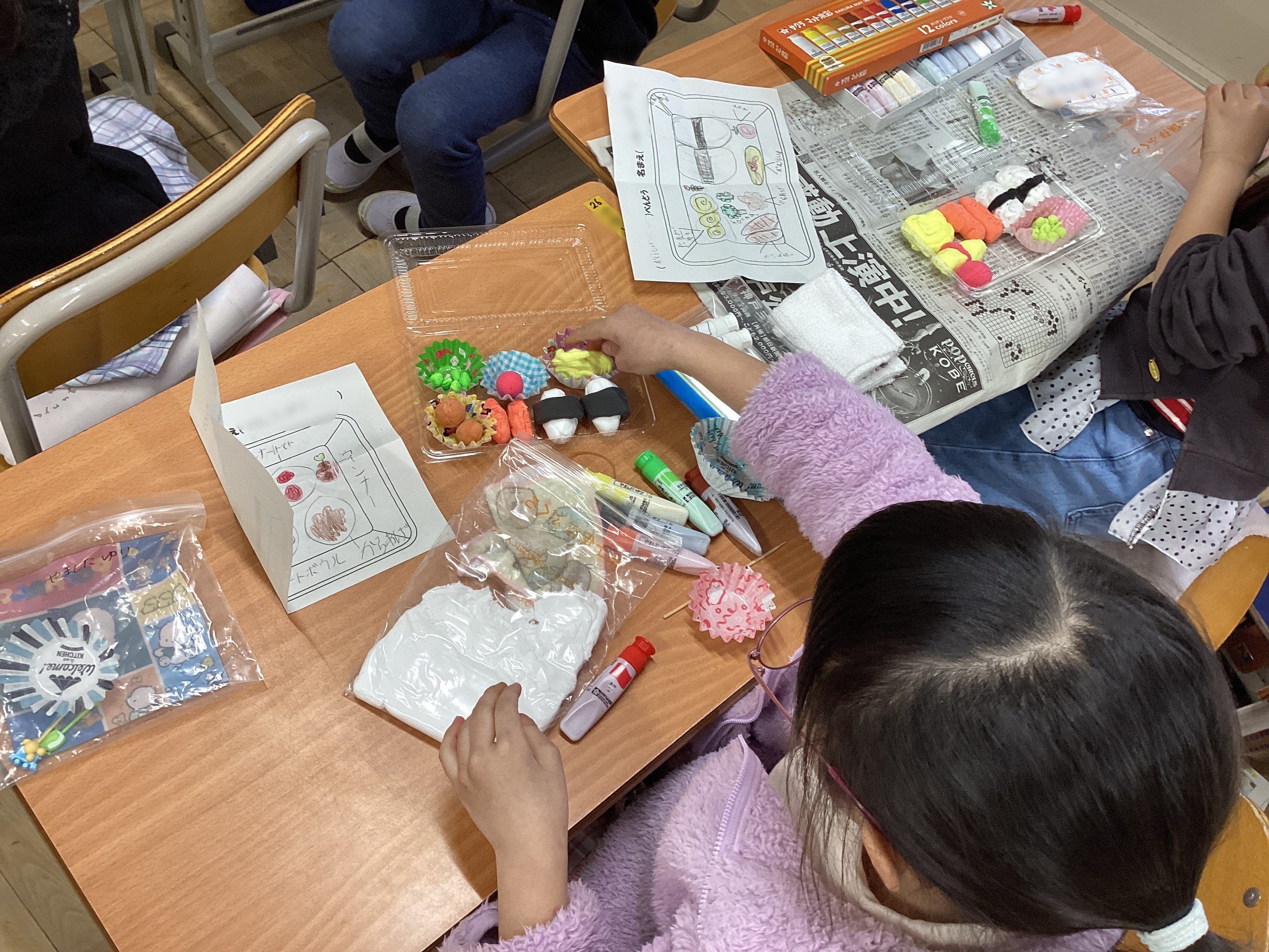 もう一方のクラスでは図工で紙粘土を使ったお弁当作りをしていました。あらかじめ描いていた完成予想図をもとに一生懸命紙粘土に絵の具を混ぜて成形している姿は真剣そのもの。見て回っていると、「見て!」とたくさんの子がアピールしてくれました。