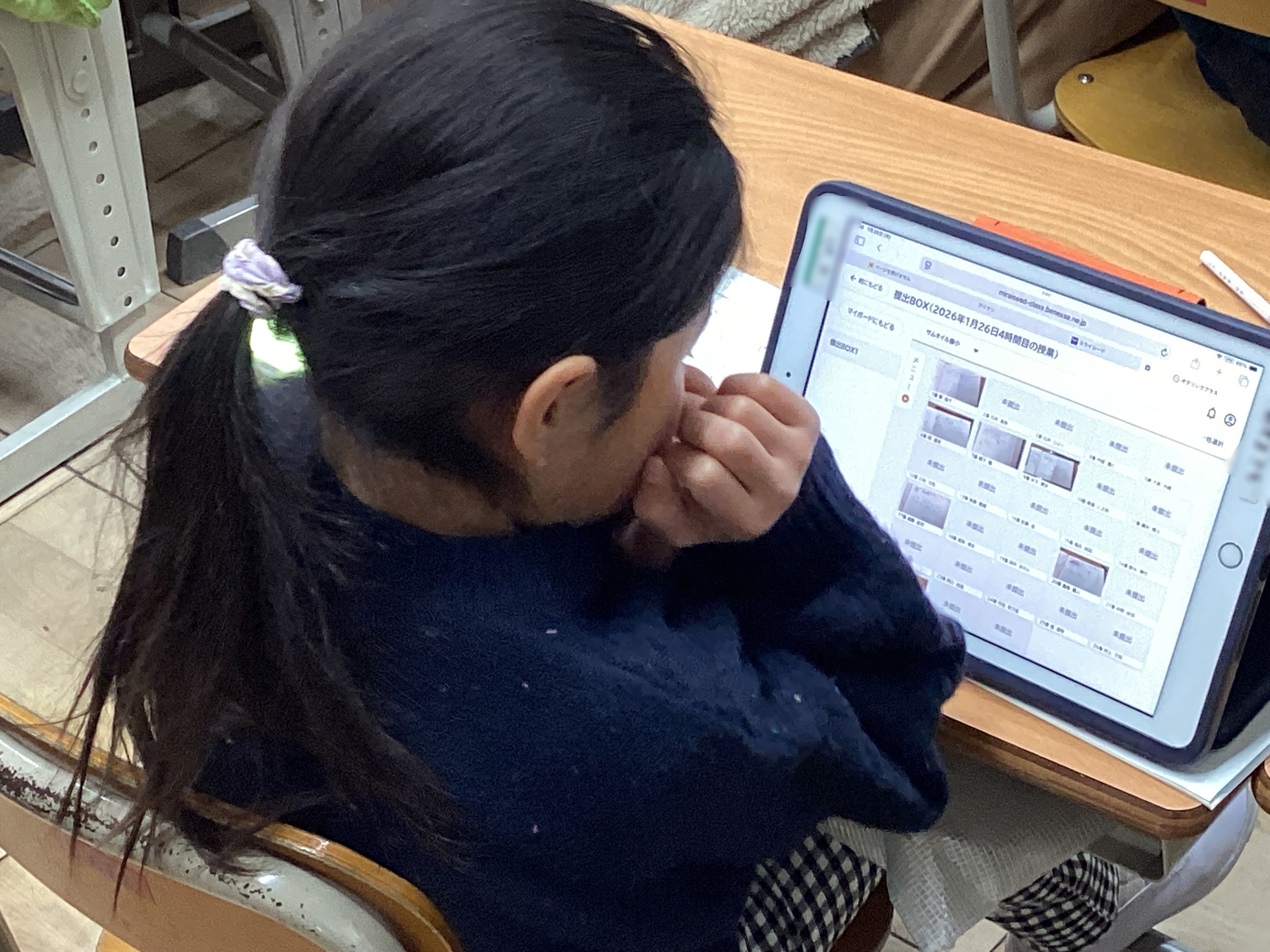 そして、その自分のノートを写真に撮り、オクリンクで共有。1年生もiPadを使いこなしています。画面上で友だちのノートを次々と見ていく中で、