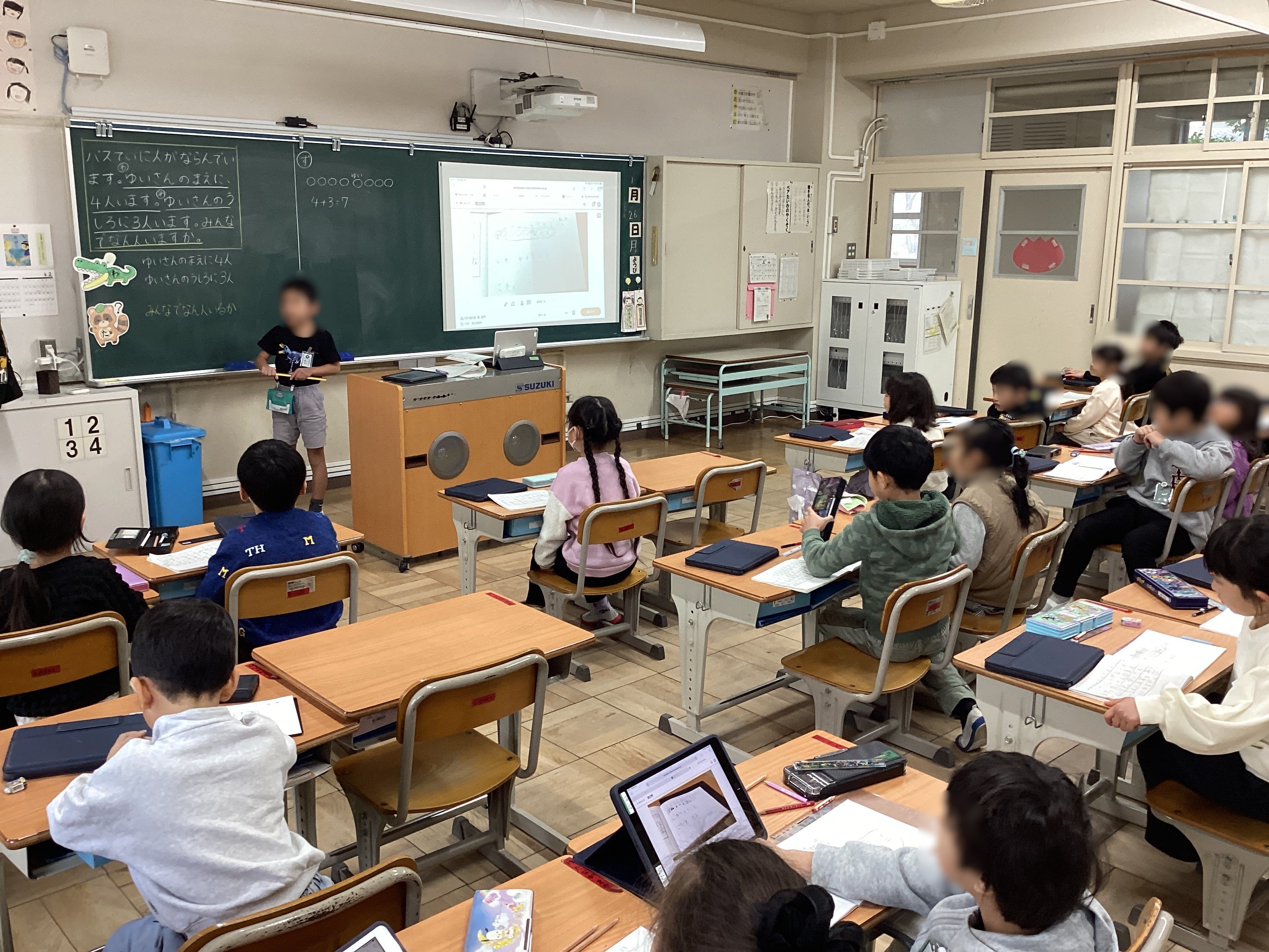 問題解決の過程で、他の子の考えに触れることにより、自分にはなかった数量関係の見方が広がり、学びが深まっていきます。みんなの前で発表するだけでは一部の子の考えにしか触れられなかったのが、ICTを活用することによって画面上で全体共有でき、すべてのクラスメイトの考えに触れることができる。とても便利ですね。そこから、この子の考えをもっと聞きたい!となったらその子に全体で考え方を伝えてもらい、それを基にみんなで対話することができると学びが深まります。