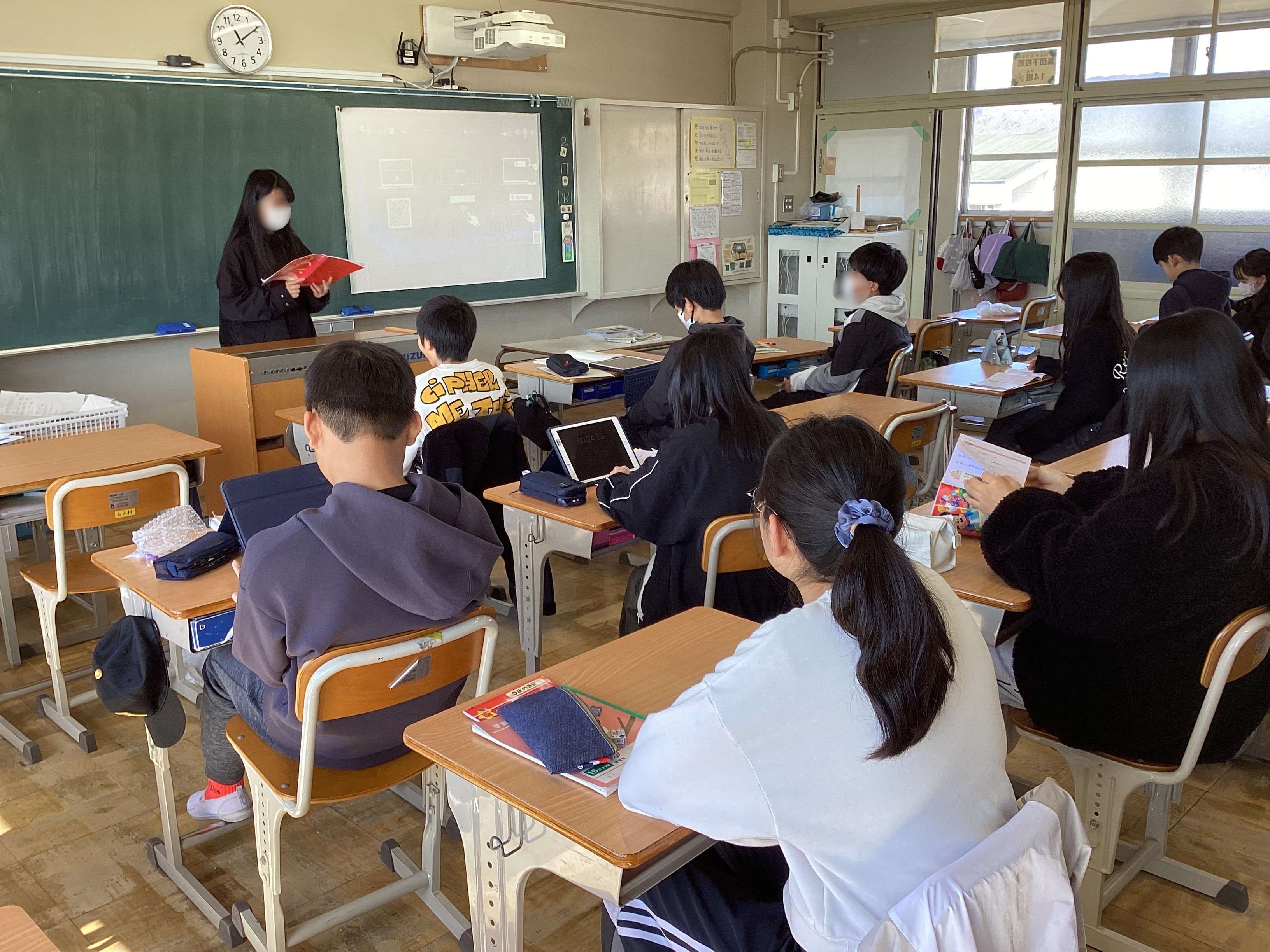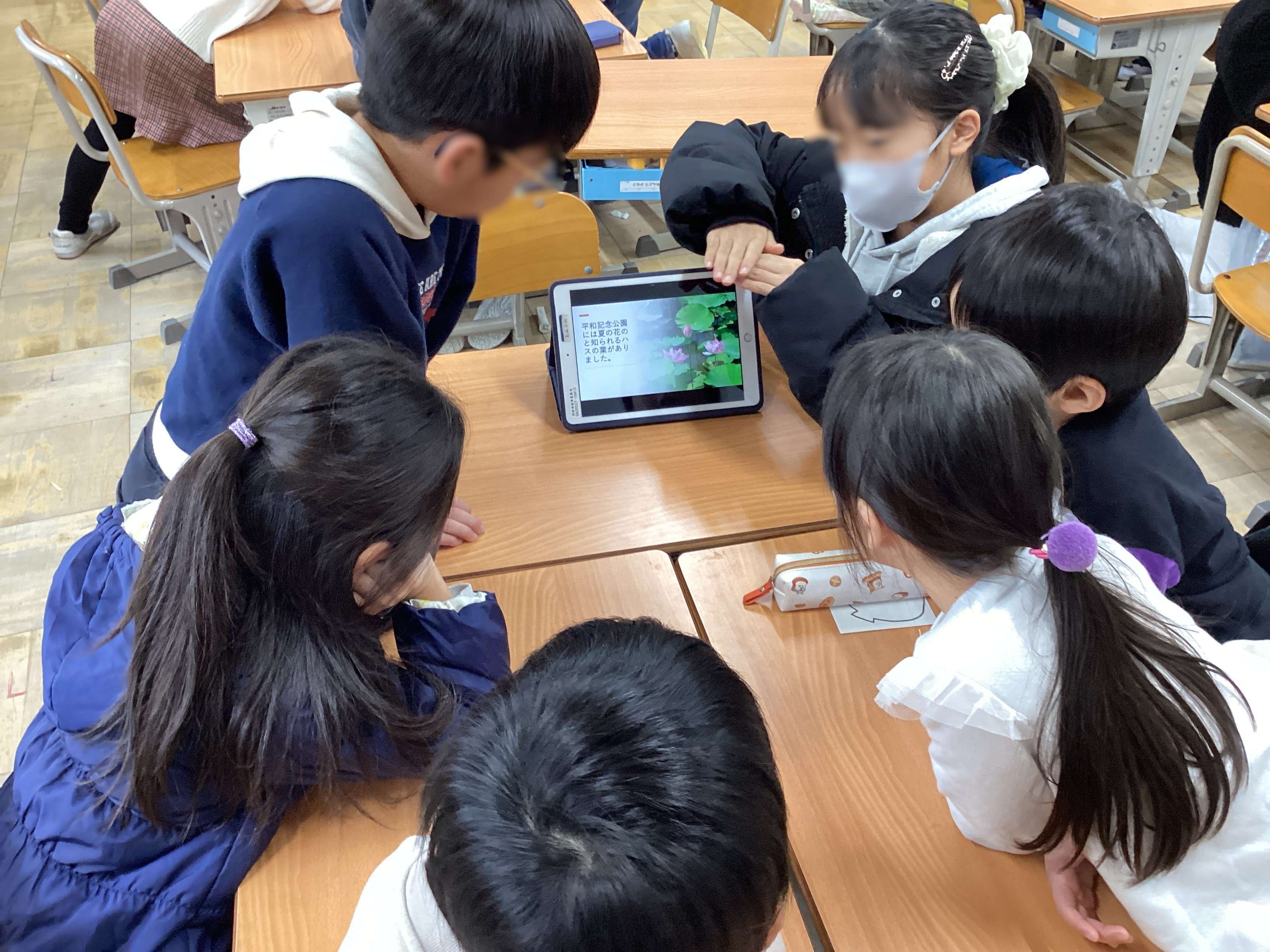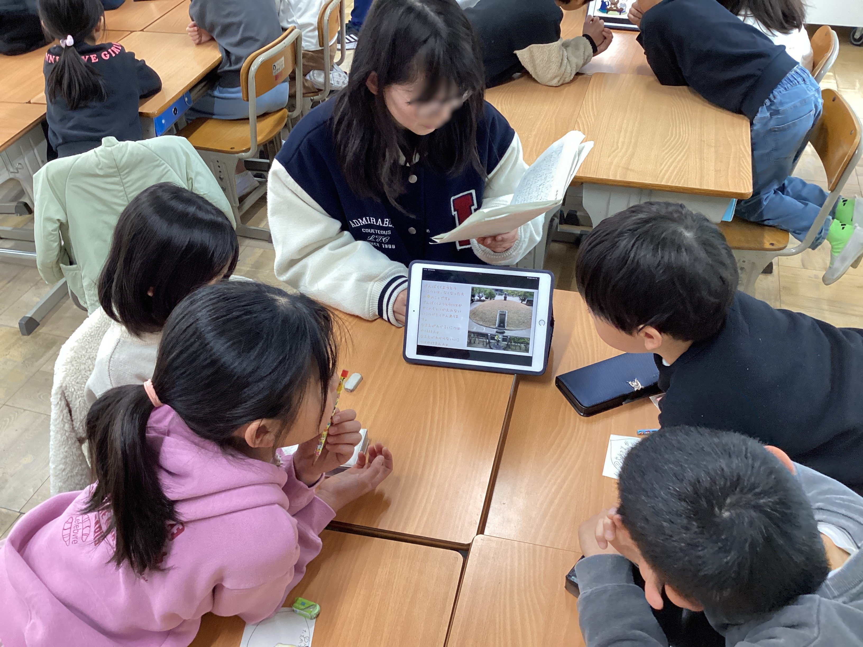 平和学習を通して学んだこと、後輩たちに伝えたいことを一人ひとりがiPadを使ってまとめ、1年生から5年生の各教室に分かれて伝えてくれました。