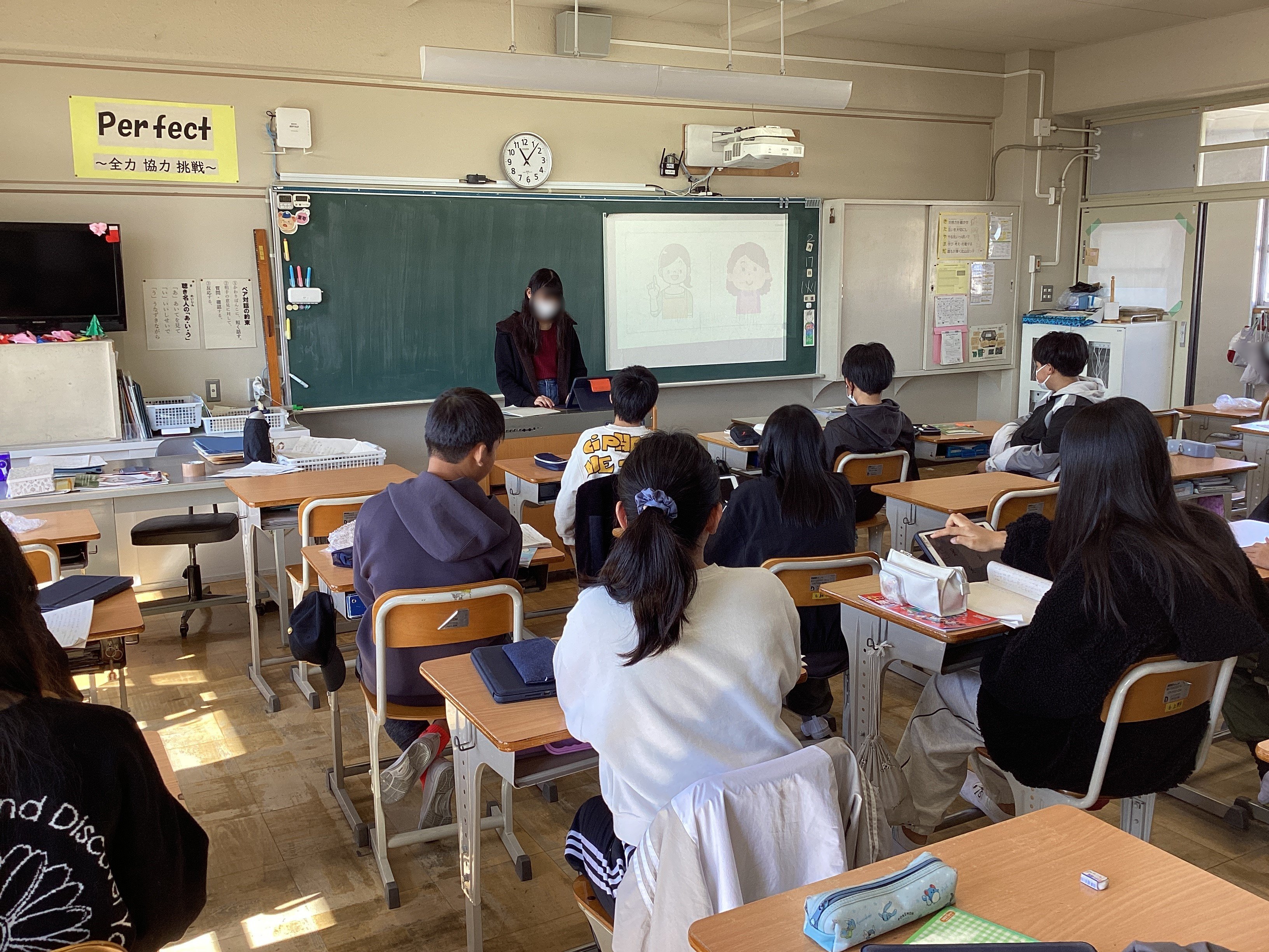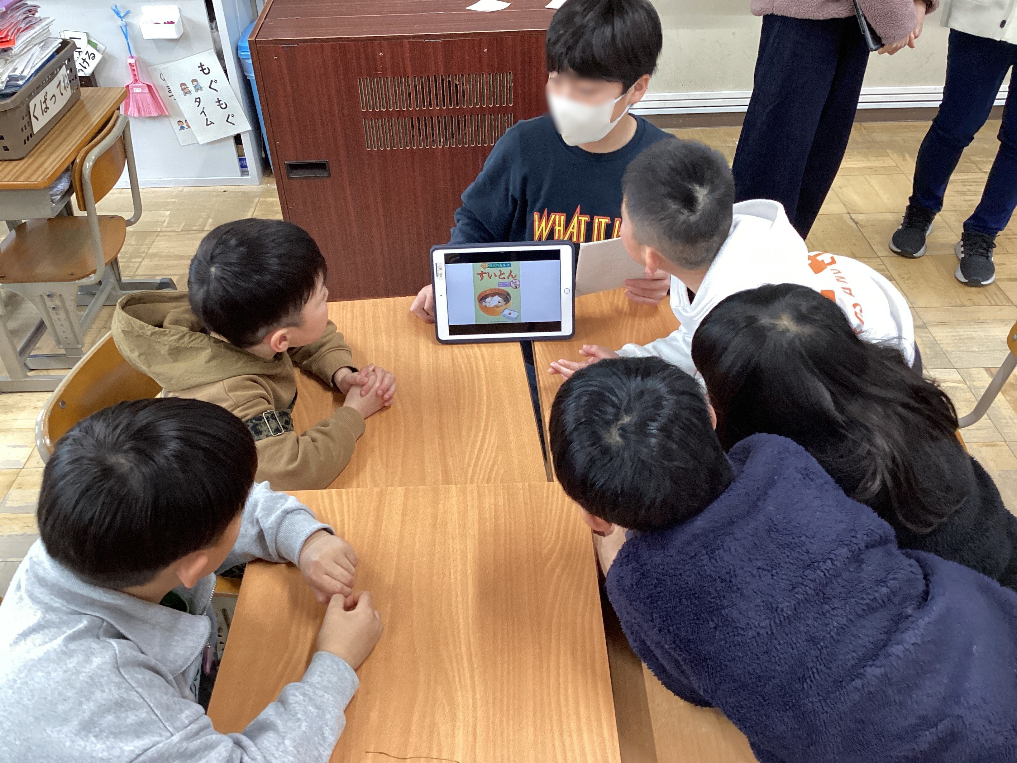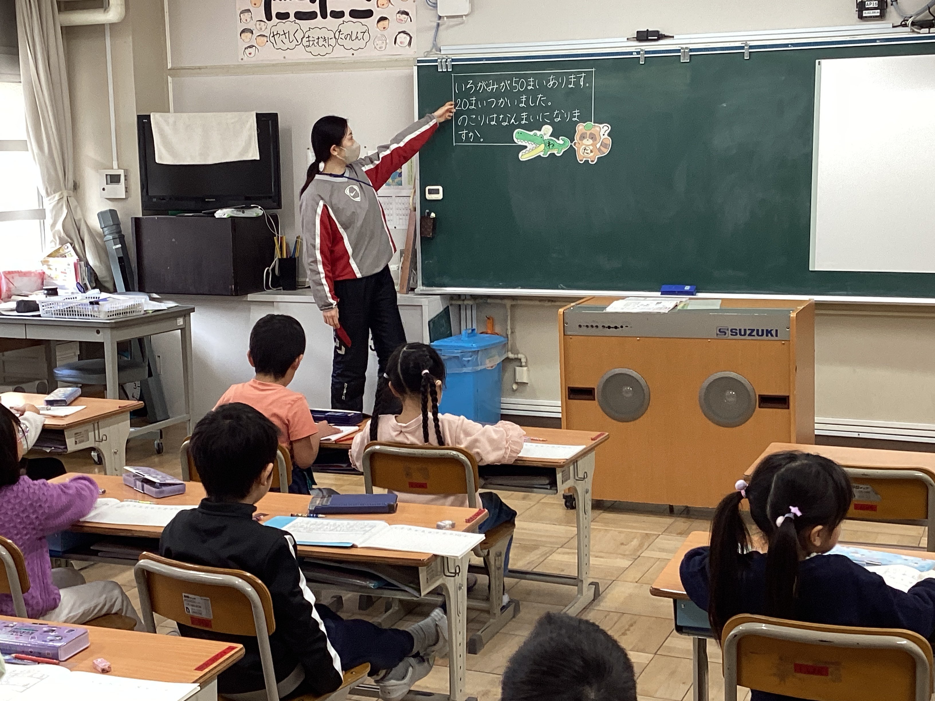という声が。そのオーダーに先生が棚の中からワニ(わかったワニ)とタヌキ(たずねタヌキ)のイラストを取り出し、黒板に貼りました。