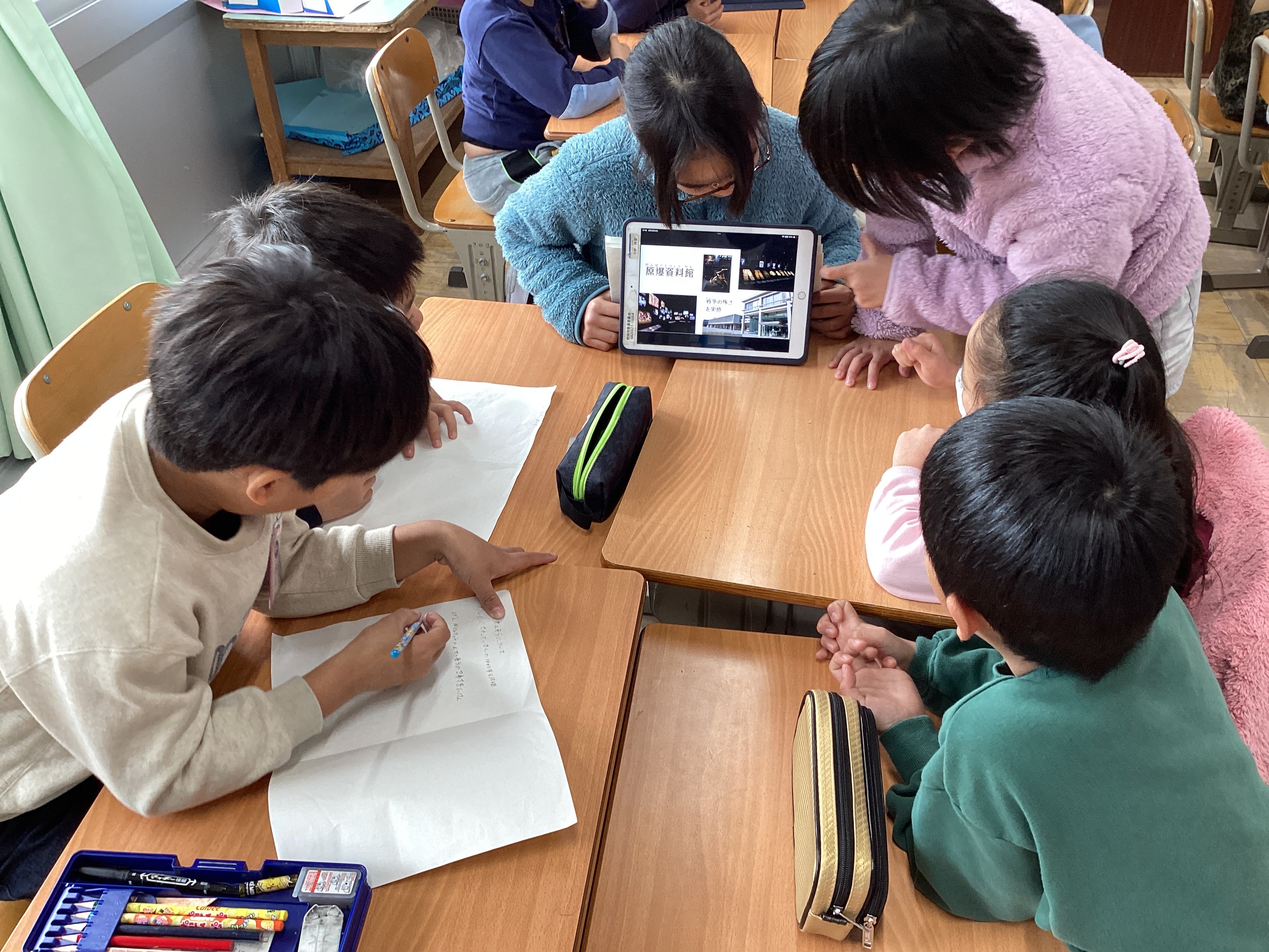 全校児童が一堂に会して行う報告会はこれまで何度も経験してきましたが、このように、より近い距離で一人ひとりが学んだことを伝えることで、6年生にとってもより自分事として平和を捉えることに繋がっているし、聞く側としてもとても興味を持って聞くことができているようでした。