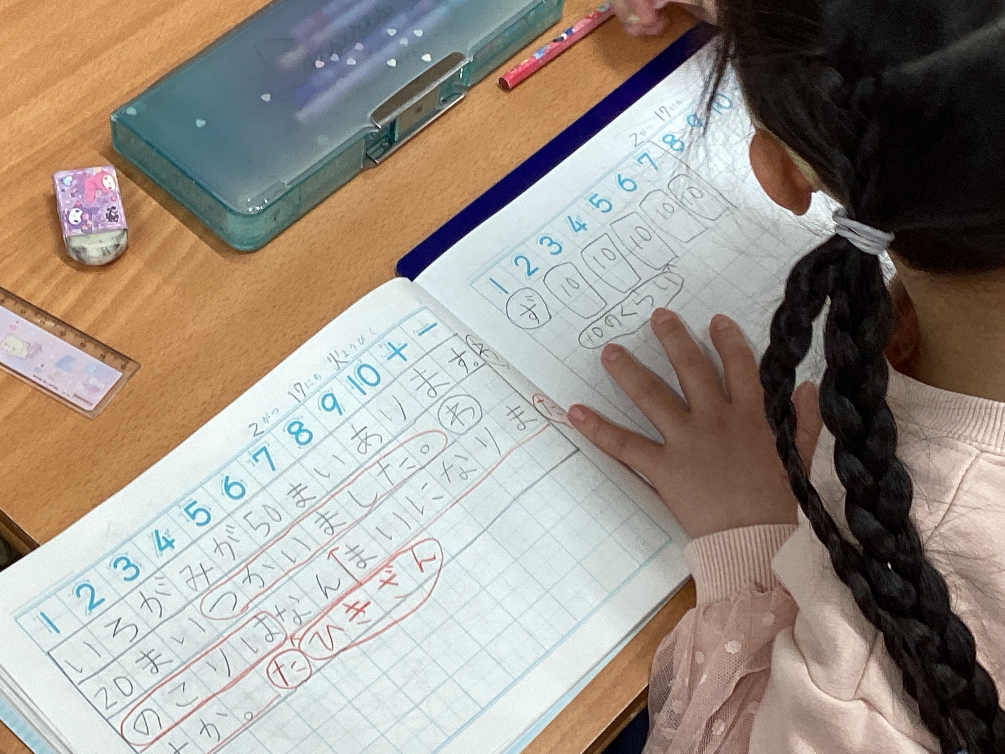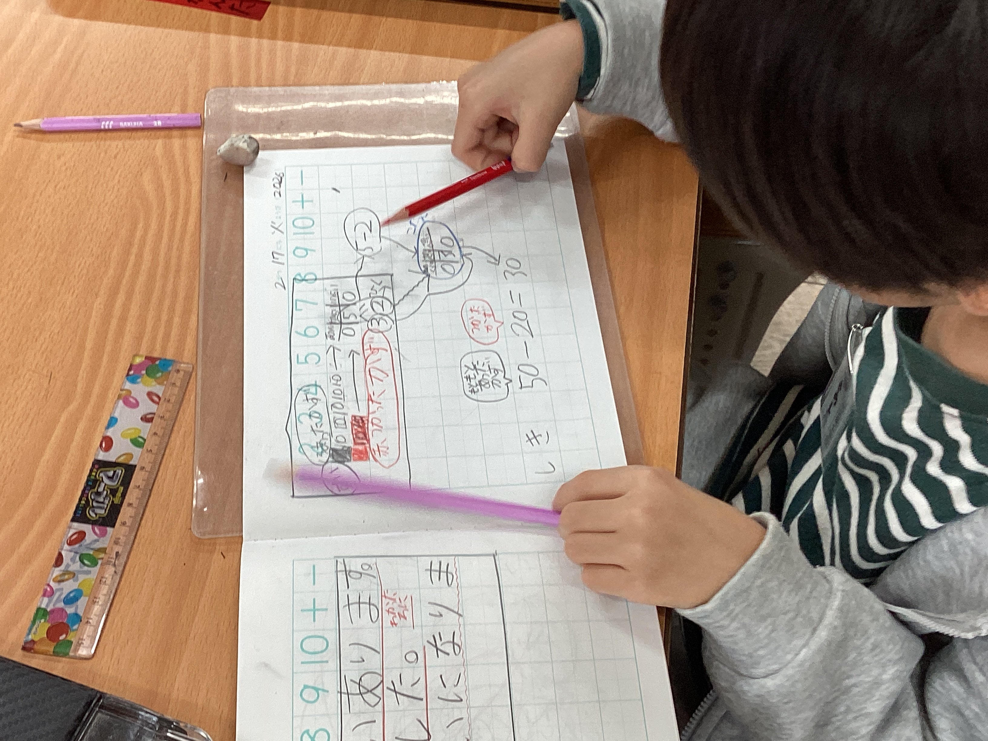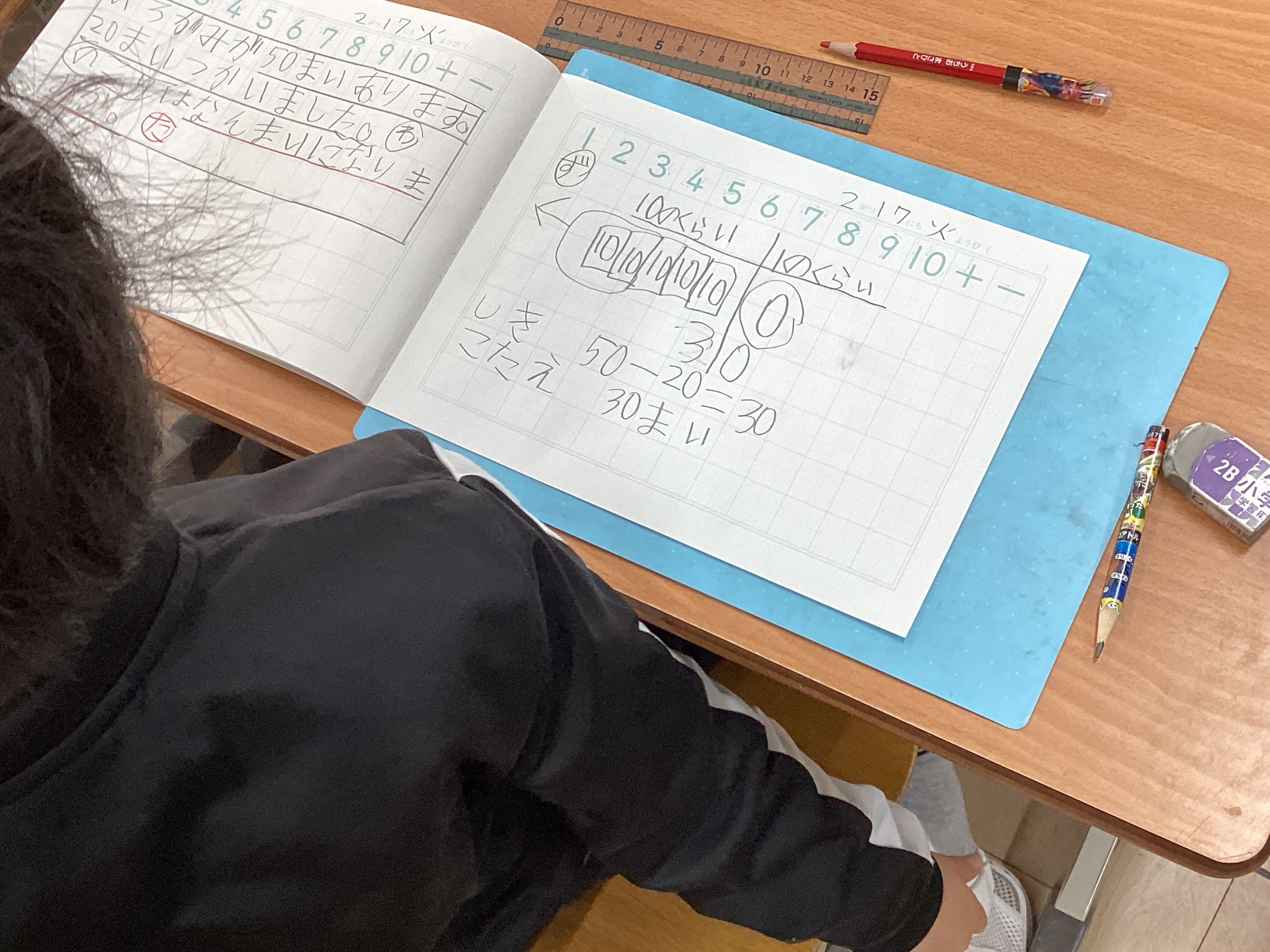 そこから別の教室へ行ったので見ていないのですが、担任に聞くと、友だちの考えに触れることで、10のまとまりで考えた方が分かりやすいし、10のまとまり5つから10のまとまり2つを引くと考えると5-2と同じように計算できるということにも気づけたようです。