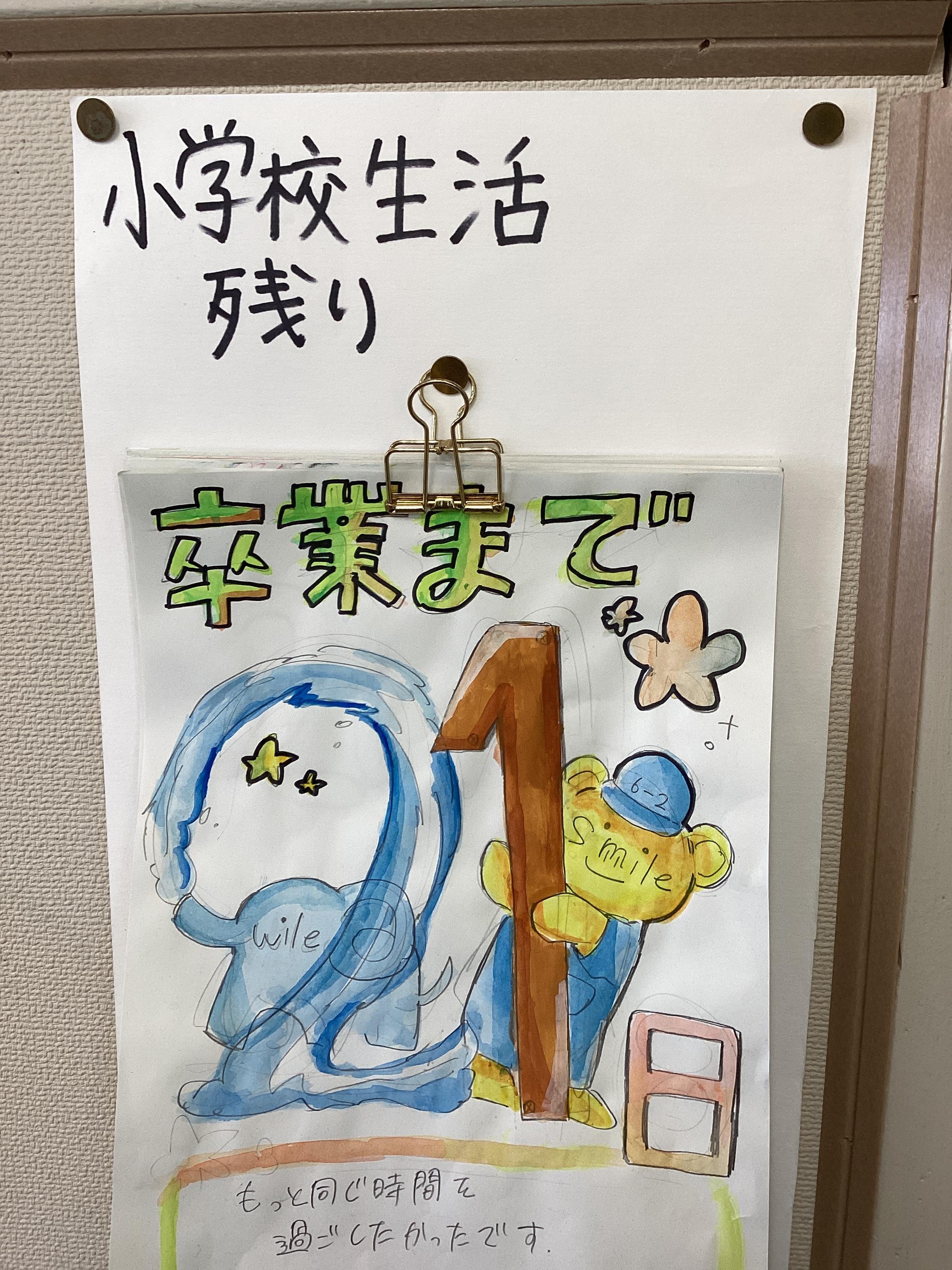 写真は、教室に貼られていた子どもたちが作っているカウントダウンのカレンダー。今日で登校日数は21日。次、登校したら残り17日。残り少ない貴重な一日一日を大切に過ごしてほしいと思います。学級閉鎖中は、申し訳ないけど、登校したい気持ちを我慢してください...。
