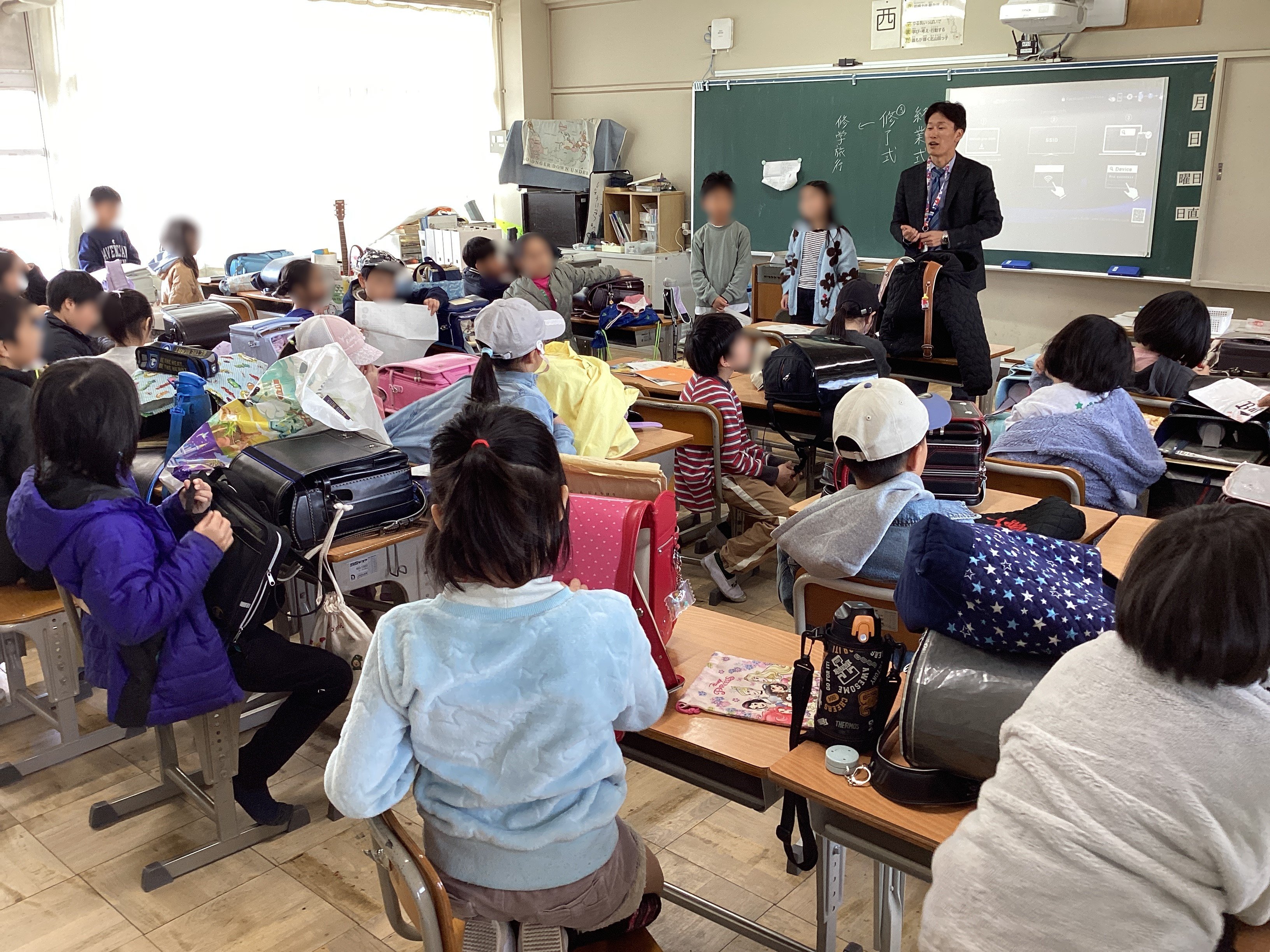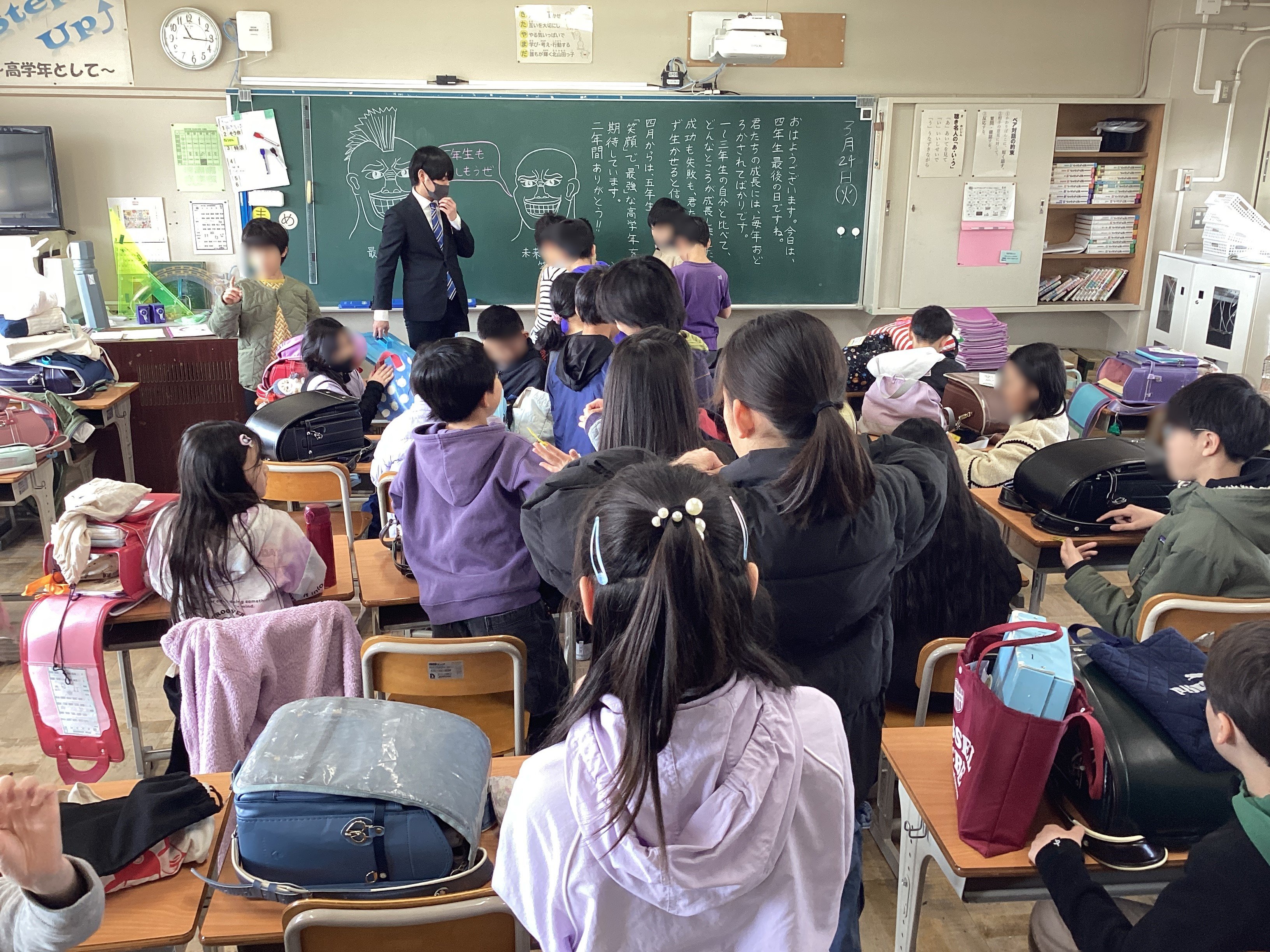 4年生では、先生から子どもたちの頑張りと成長を具体的に伝えており、それを子どもたちはとても誇らしげに前のめりで聴いていました。日々、子どもたちは成長を実感していたでしょうが、年度最後の日に担任の先生から褒めてもらい、さらにそれを実感したと思います。素敵な光景でした。