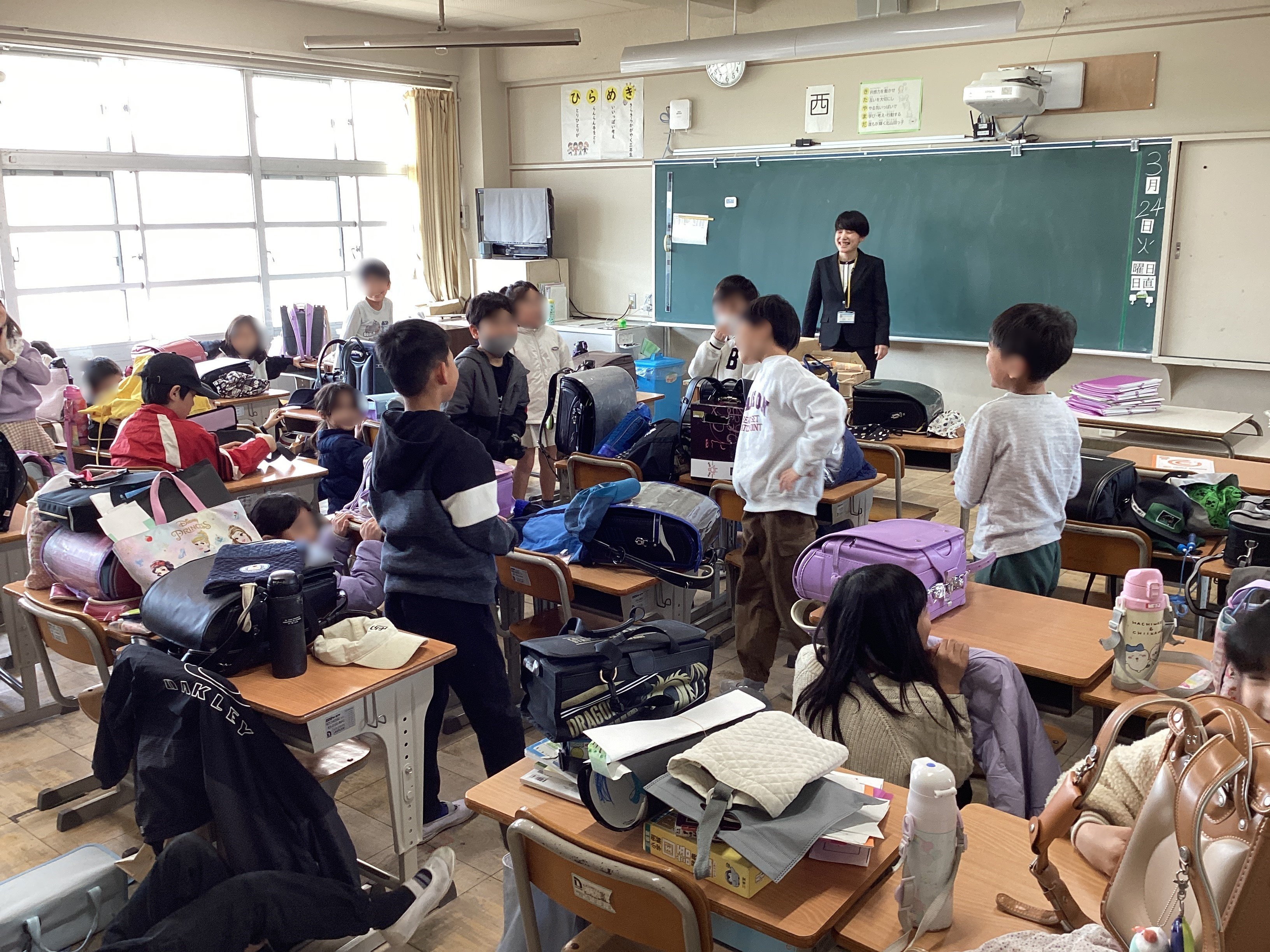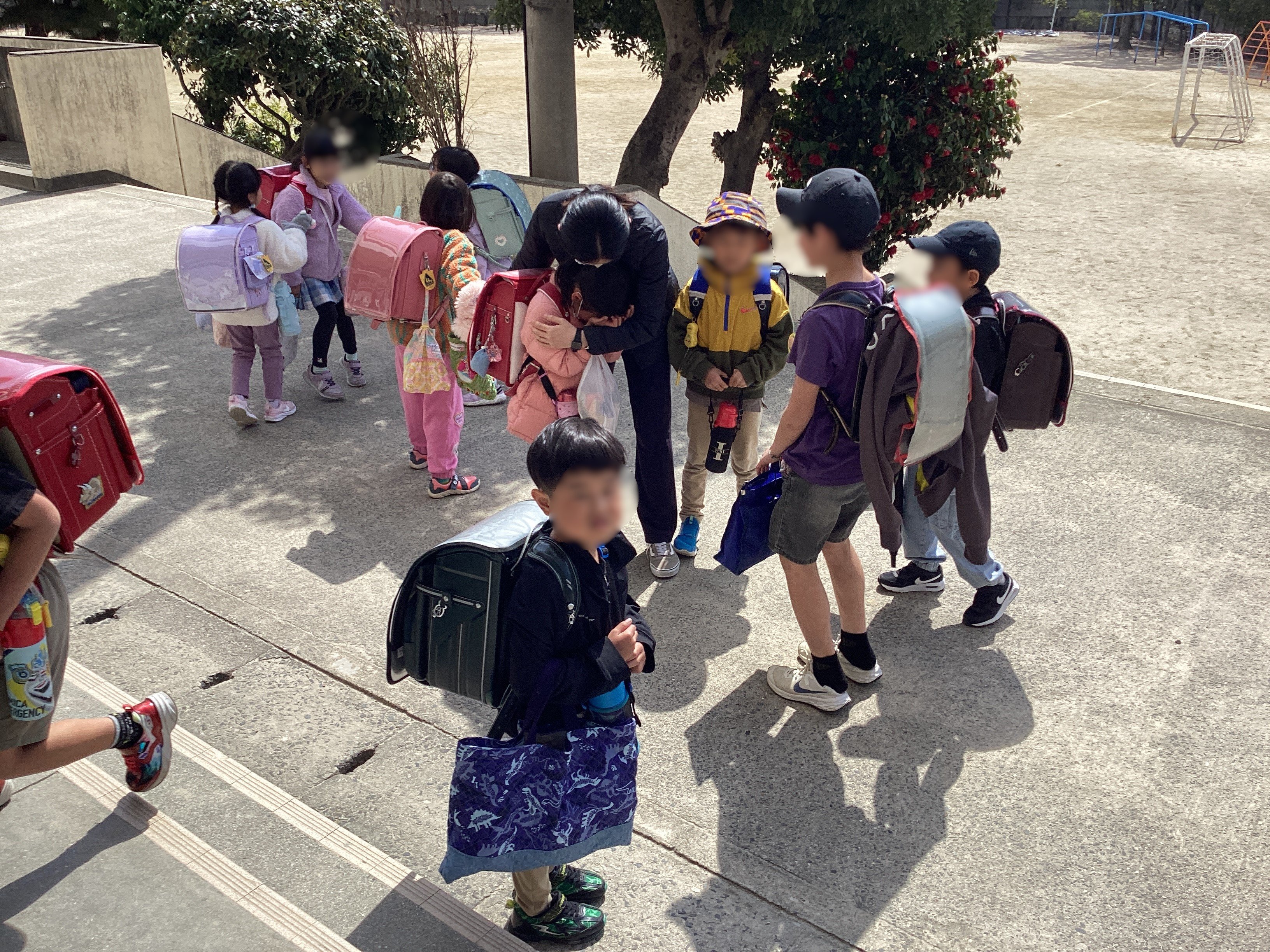 1年生は先生と別れるのが寂しすぎて泣いている子が多数...。下校の時も玄関前で、見送る先生に抱き着いて泣いていました。とっても楽しい1年を過ごしていたことがよく分かる光景で微笑ましかったです。