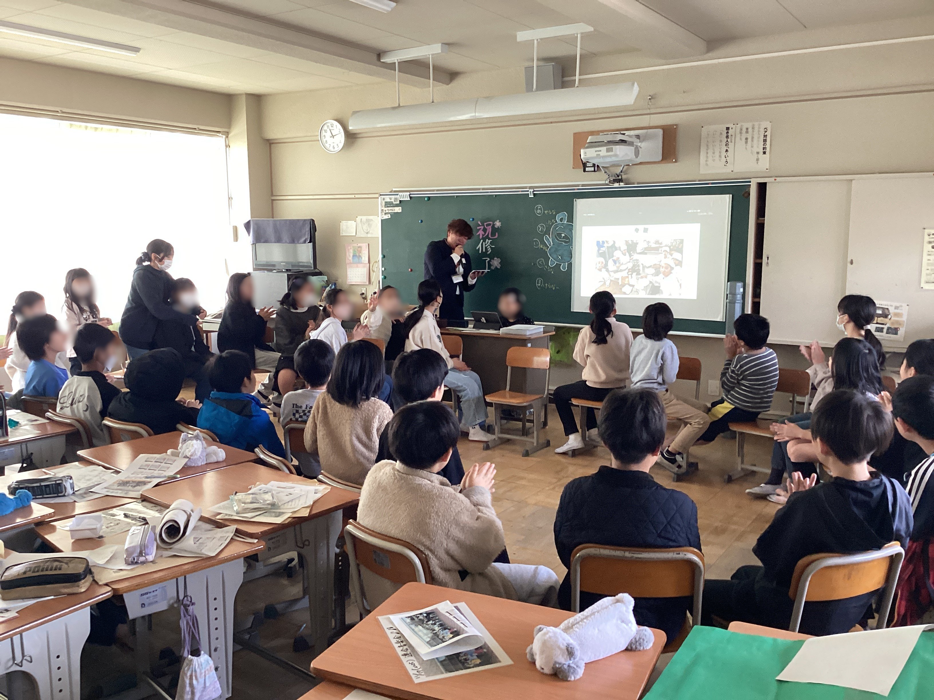 先生から子どもたちの頑張りを称え、出会たことに感謝を伝えている場面