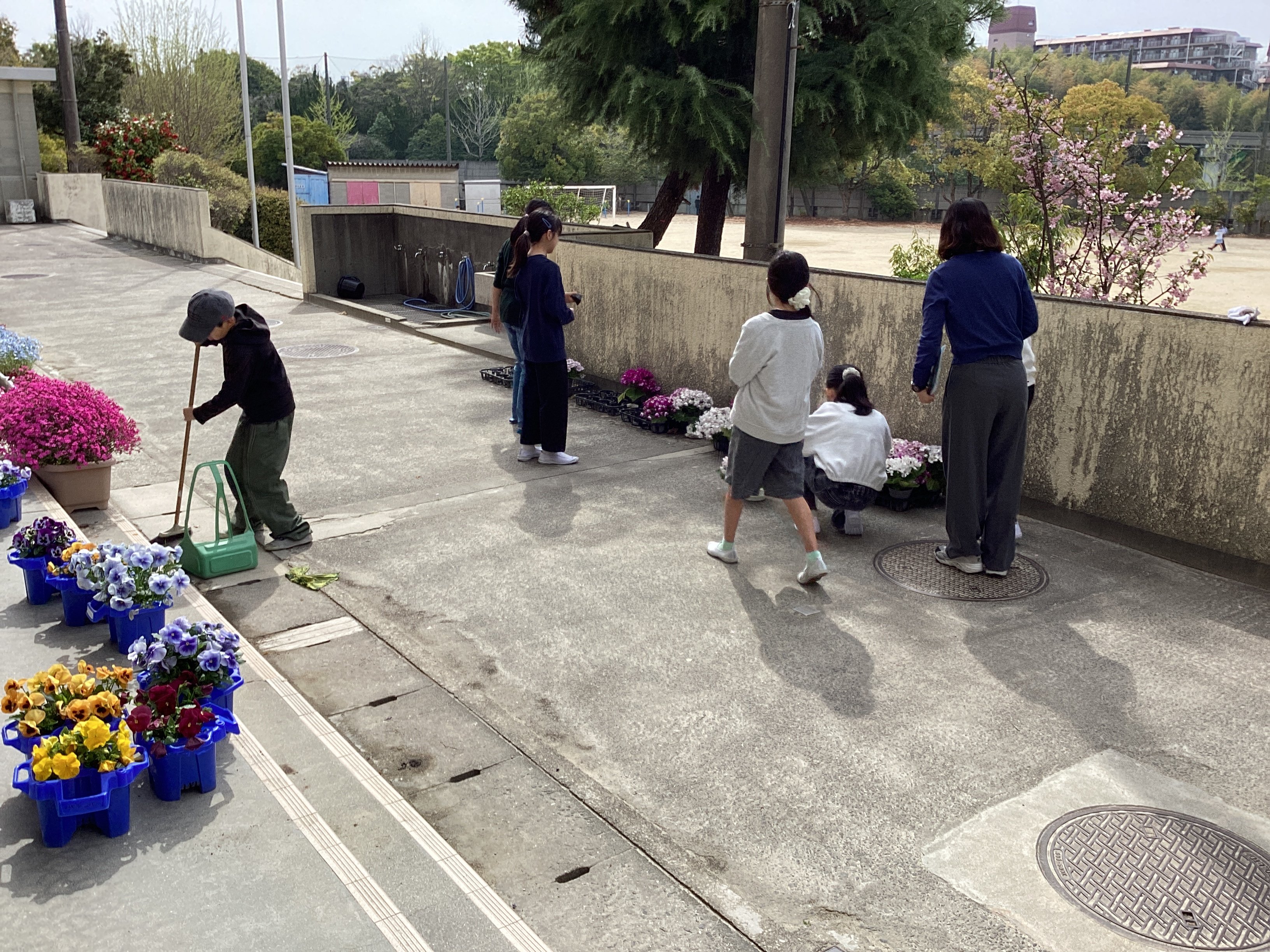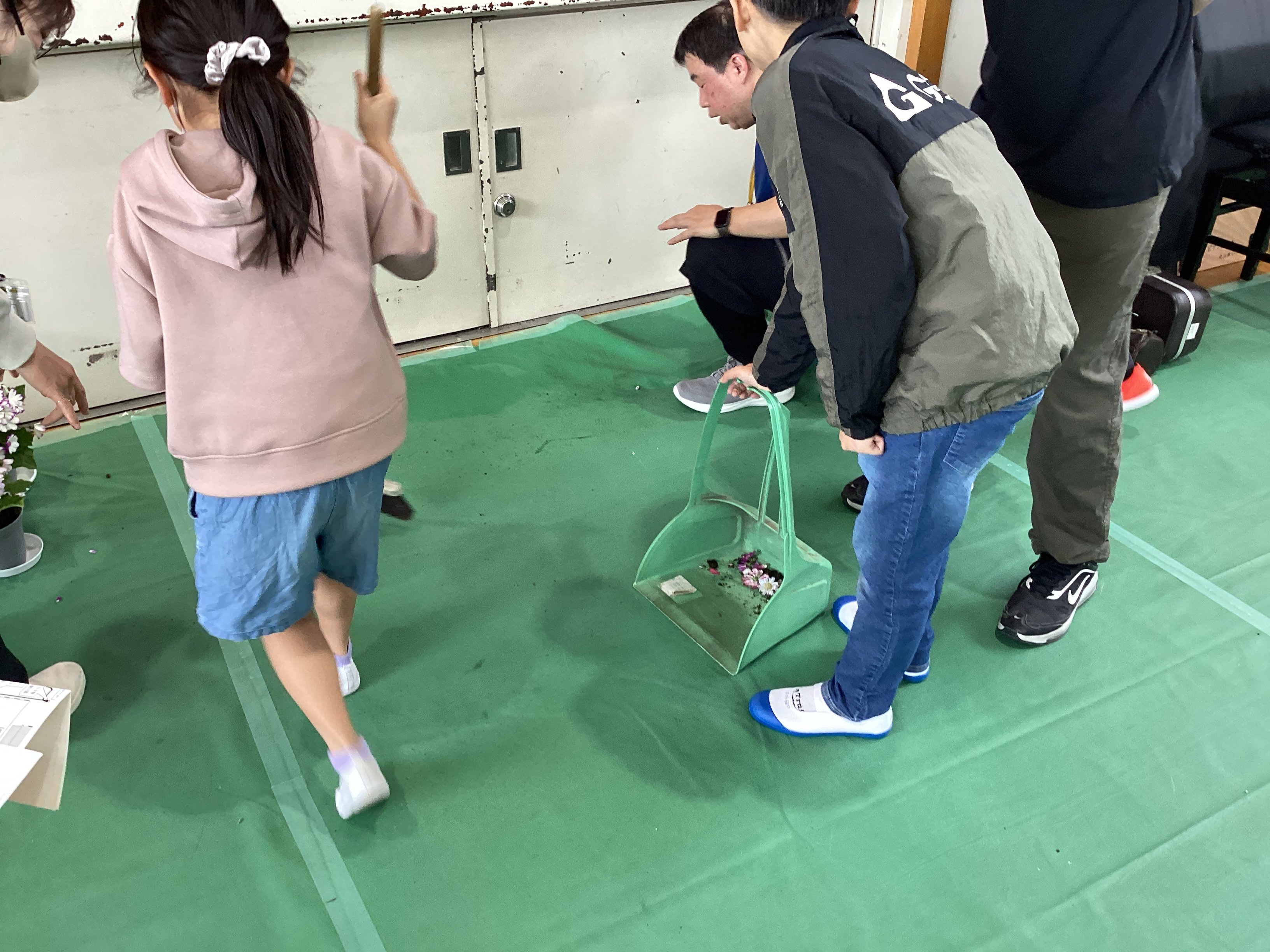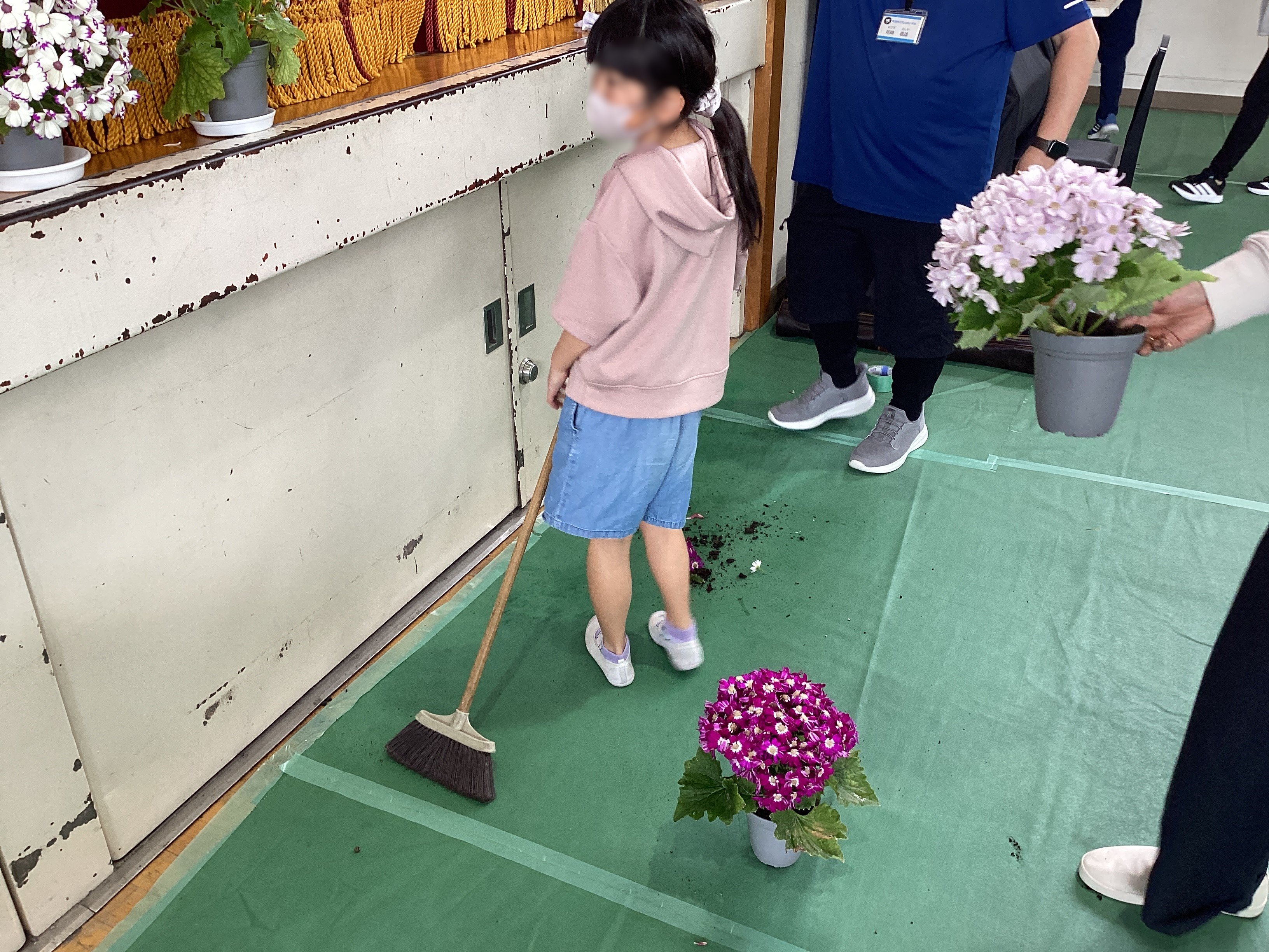 先生たちが慌てて扉を閉めたりしているうちに、なんと!新6年生がその状況を察知し、すぐにほうきとちりとりを持ってきてこぼれた土を掃除し始めたのです。
